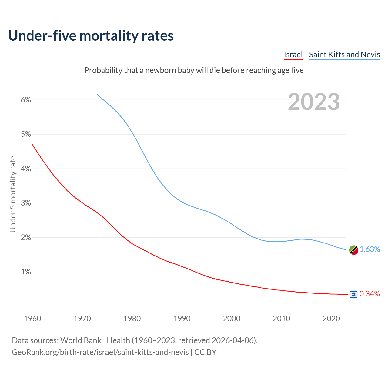 The chance that a newborn baby will die before reaching age five is 0.34% in Israel and 1.63% in Saint Kitts and Nevis. Above is a chart with historical data on under-five mortality rates.