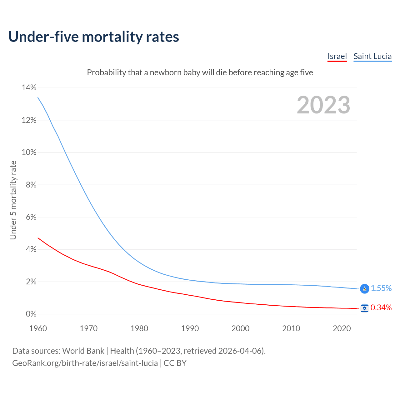 The chance that a newborn baby will die before reaching age five is 0.34% in Israel and 1.55% in Saint Lucia. Above is a chart with historical data on under-five mortality rates.