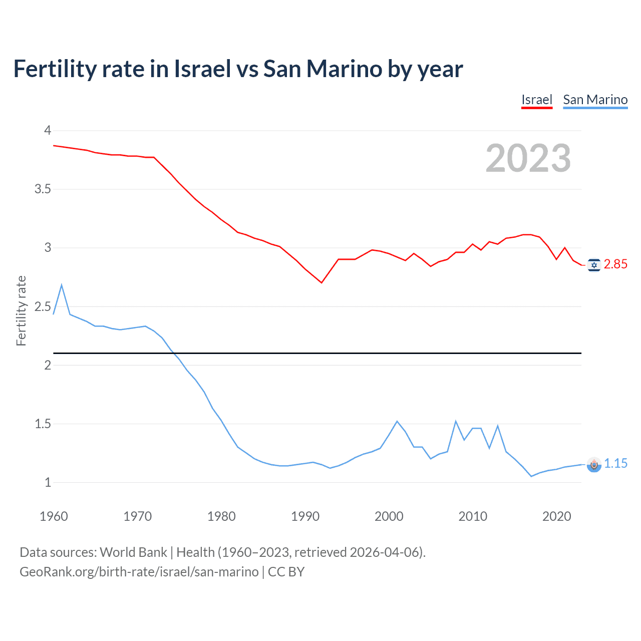 According to the latest available data on birth rates, the fertility rate in Israel was 2.85 children per woman in 2023, compared to 1.15 in San Marino in 2023. The replacement level is considered to be 2.1 children per woman.