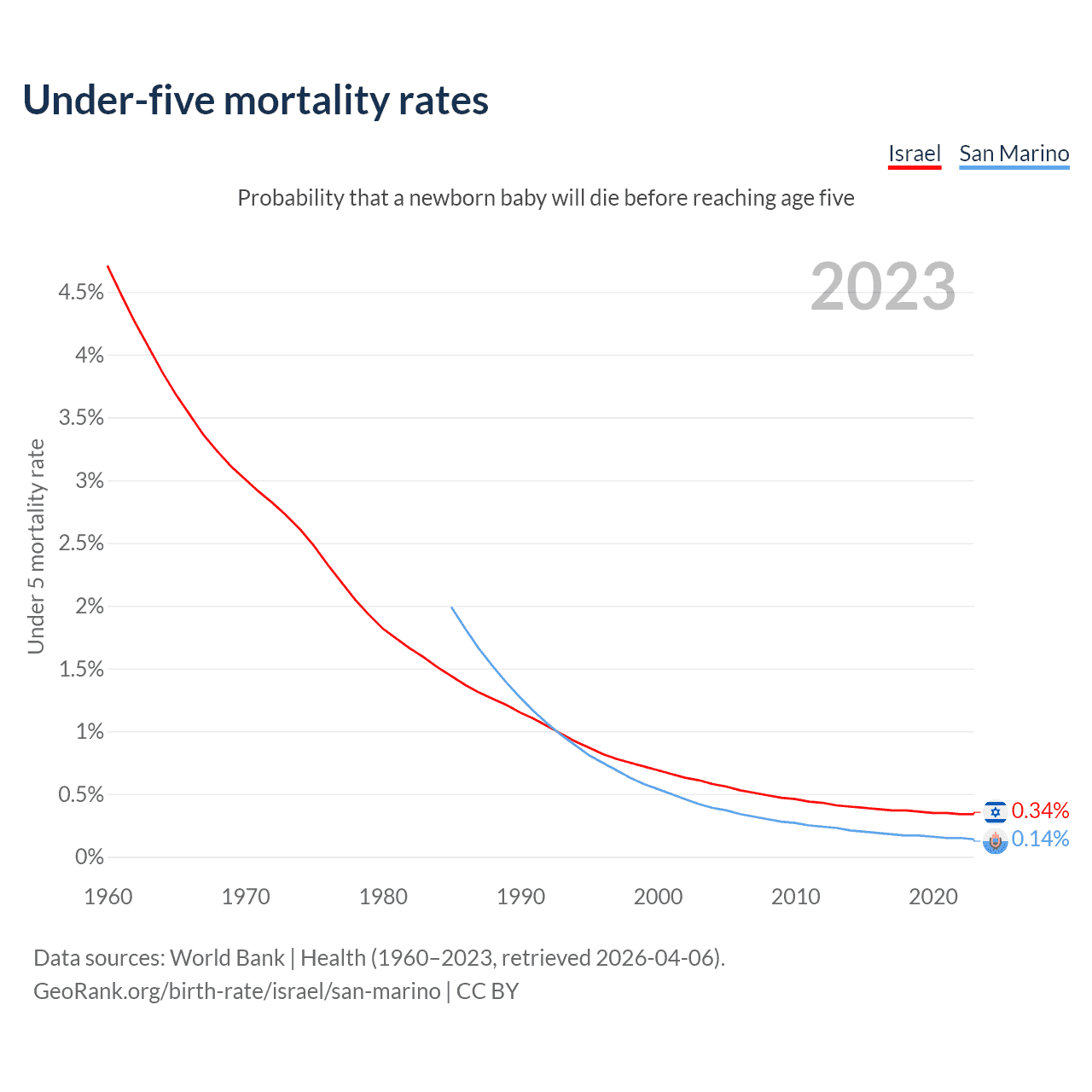 The chance that a newborn baby will die before reaching age five is 0.34% in Israel and 0.14% in San Marino. Above is a chart with historical data on under-five mortality rates.