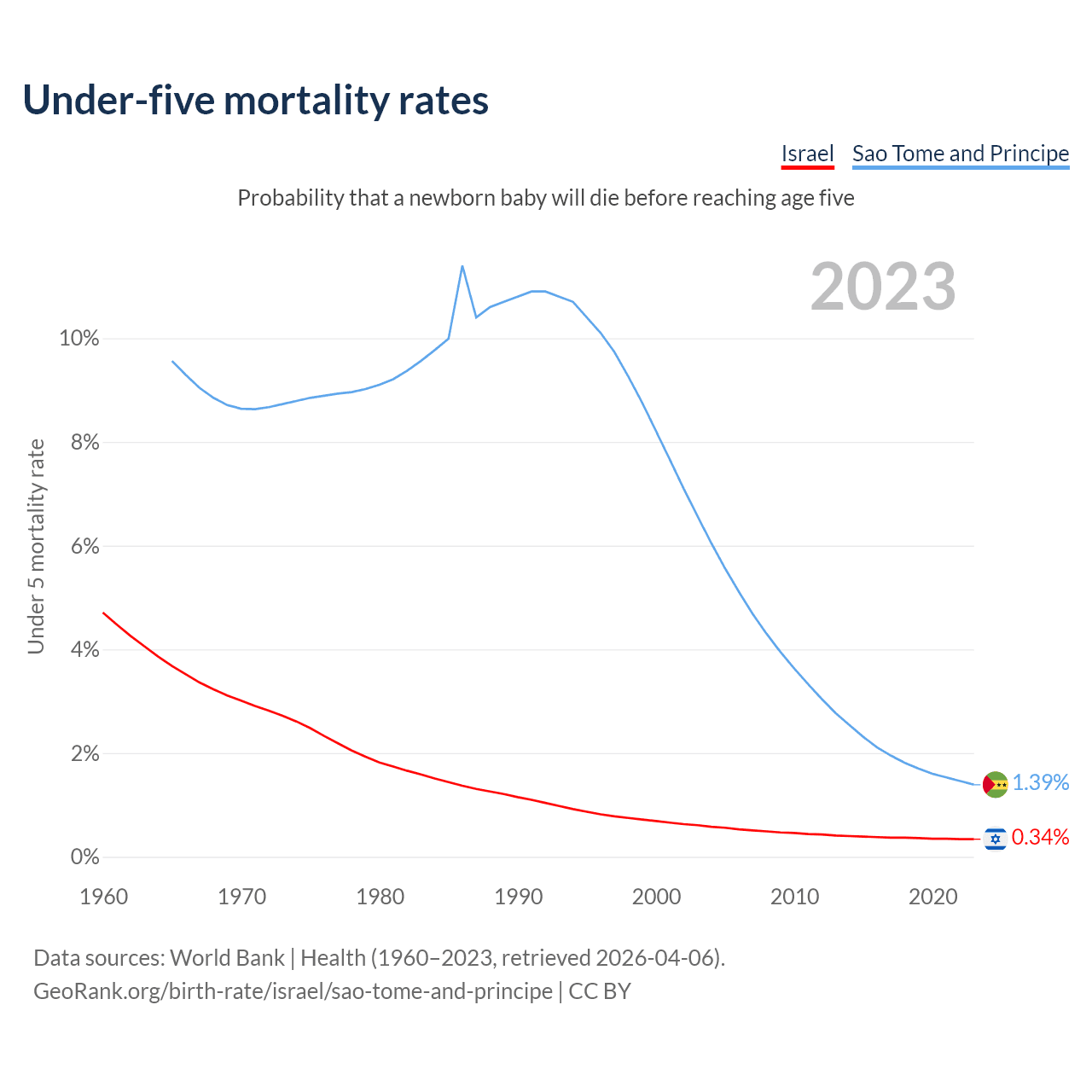 The chance that a newborn baby will die before reaching age five is 0.34% in Israel and 1.39% in Sao Tome and Principe. Above is a chart with historical data on under-five mortality rates.
