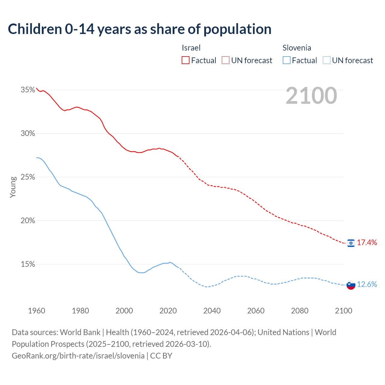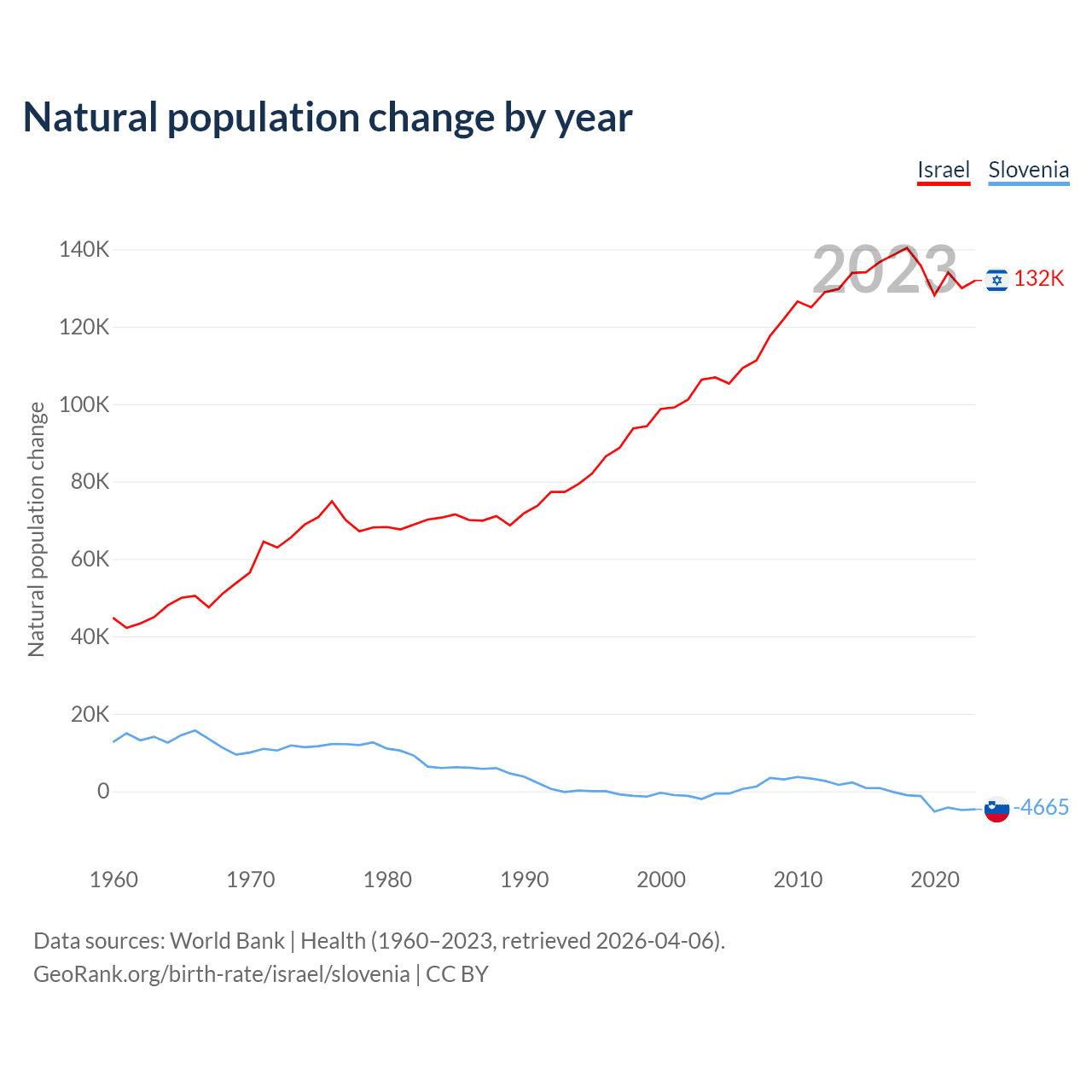 According to the latest available data on birth rates, the fertility rate in Israel was 2.85 children per woman in 2023, compared to 1.51 in Slovenia in 2023. The replacement level is considered to be 2.1 children per woman.