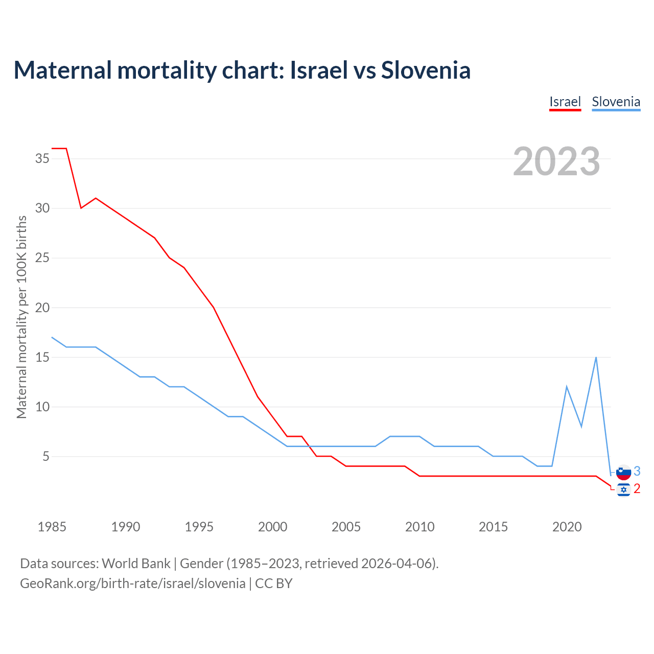 The maternal mortality rate, which is the probability of dying during childbirth or within 42 days of pregnancy termination, is 2 deaths per 100,000 live births in Israel, compared to 3 deaths in Slovenia.