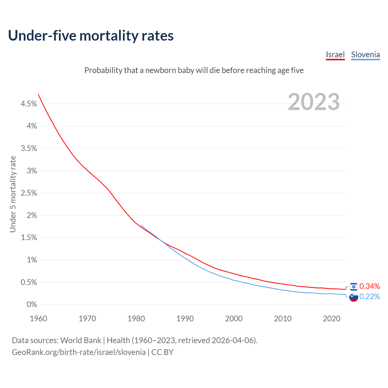 The chance that a newborn baby will die before reaching age five is 0.34% in Israel and 0.22% in Slovenia. Above is a chart with historical data on under-five mortality rates.