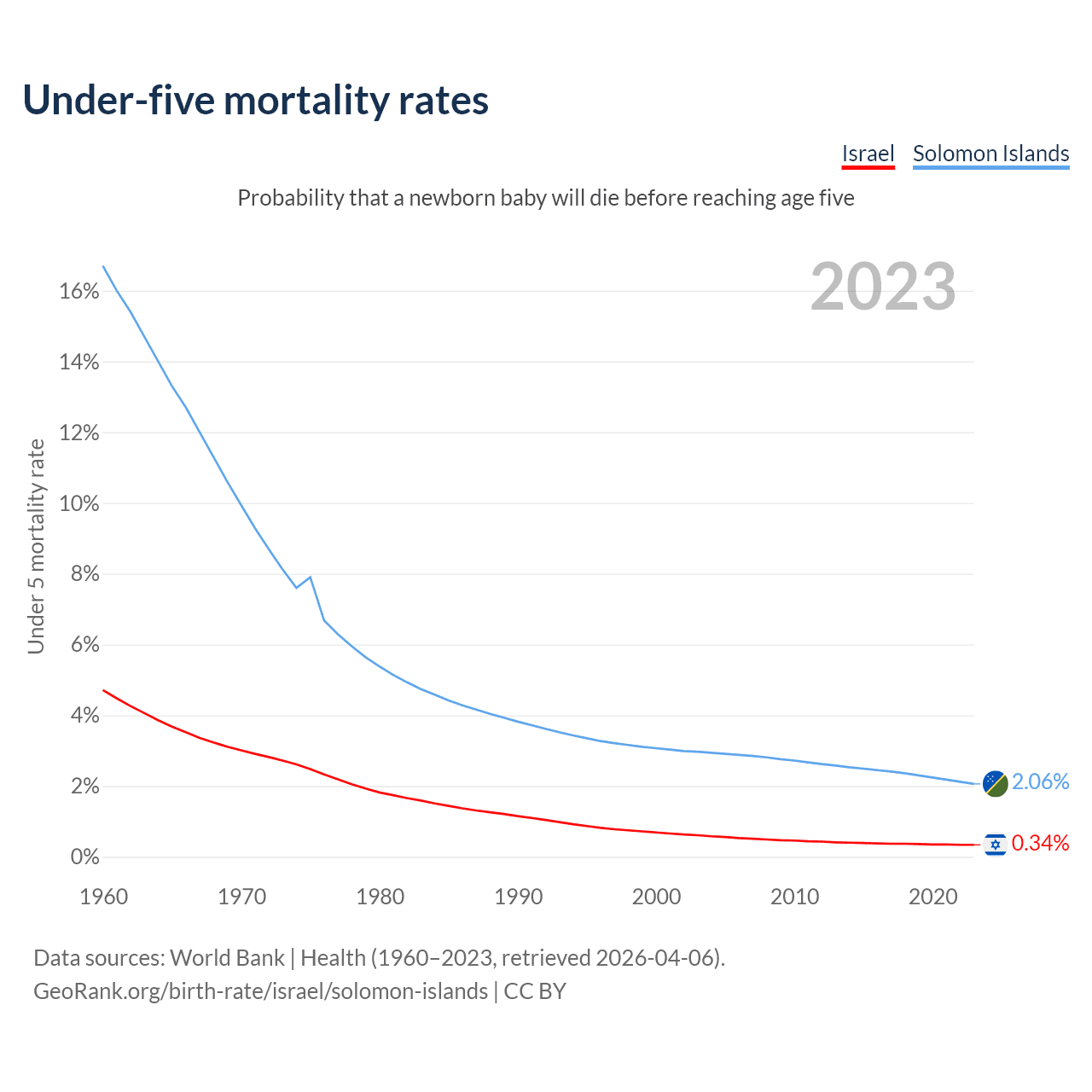 The chance that a newborn baby will die before reaching age five is 0.34% in Israel and 2.06% in the Solomon Islands. Above is a chart with historical data on under-five mortality rates.