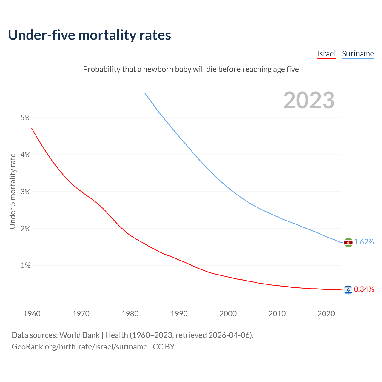 The chance that a newborn baby will die before reaching age five is 0.34% in Israel and 1.62% in Suriname. Above is a chart with historical data on under-five mortality rates.