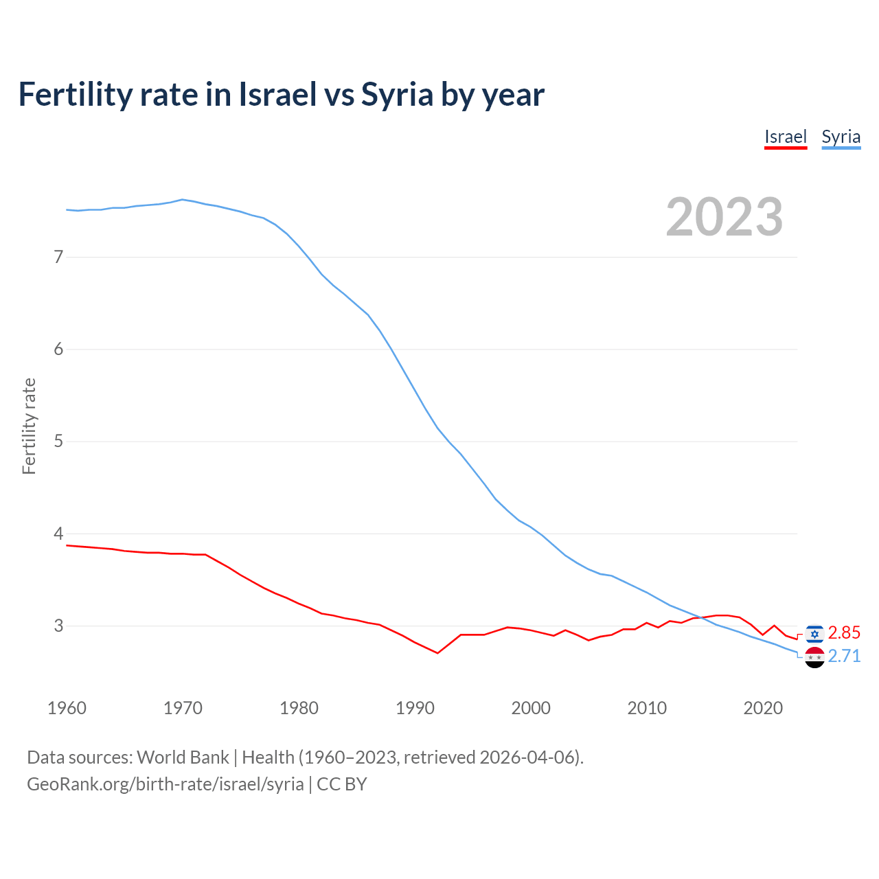 1960 vs 2023, the fertility rate has decreased by 26.3% in Israel and by 63.9% in Syria — in 1960, it was 3.87 and 7.51, respectively.