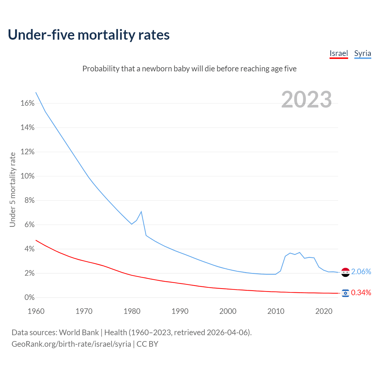 The chance that a newborn baby will die before reaching age five is 0.34% in Israel and 2.06% in Syria. Above is a chart with historical data on under-five mortality rates.