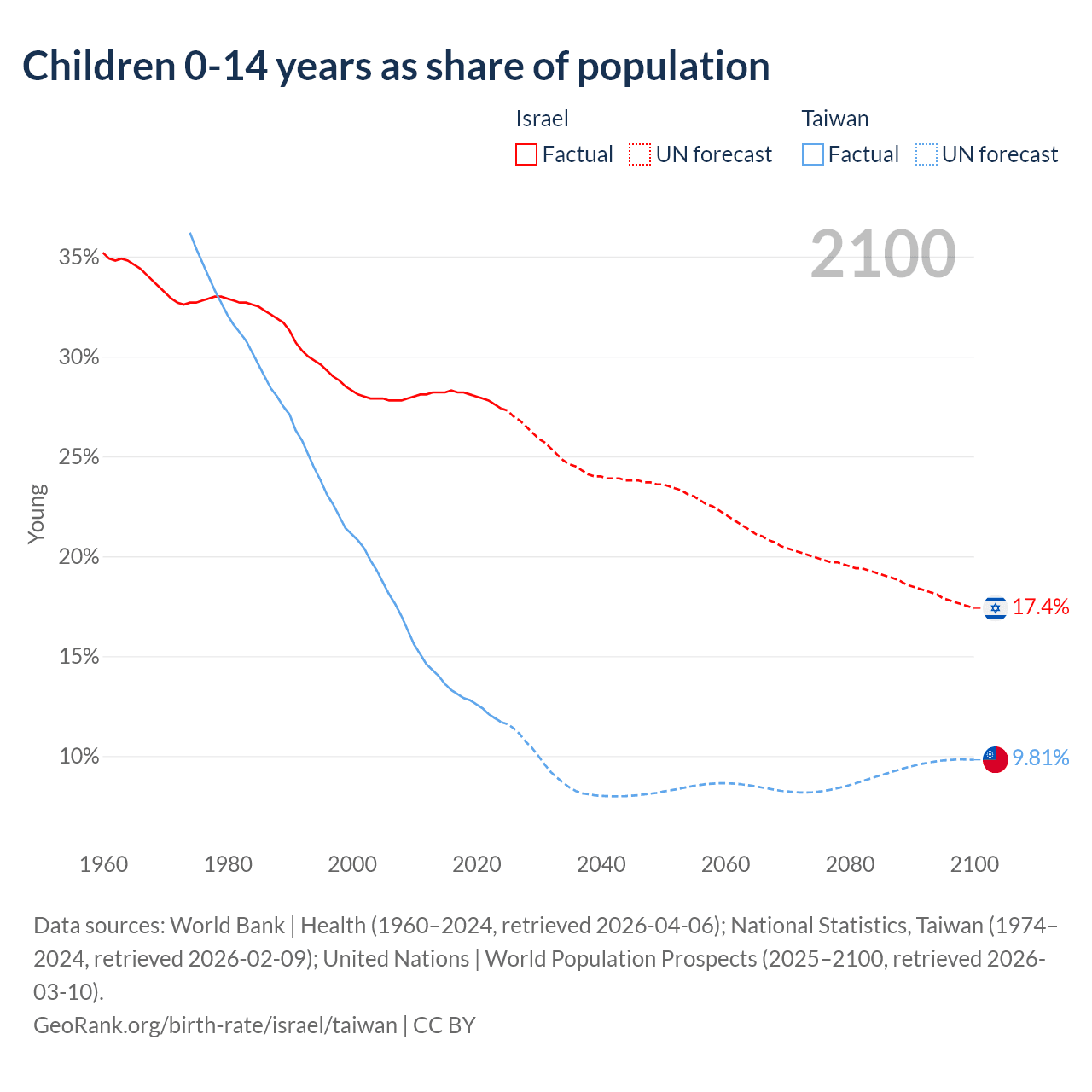 Data sources: World Bank | Health (1960–2024, retrieved 2026-04-06); National Statistics, Taiwan (1974–2024, retrieved 2026-02-09); United Nations | World Population Prospects (2025–2100, retrieved 2026-03-10).