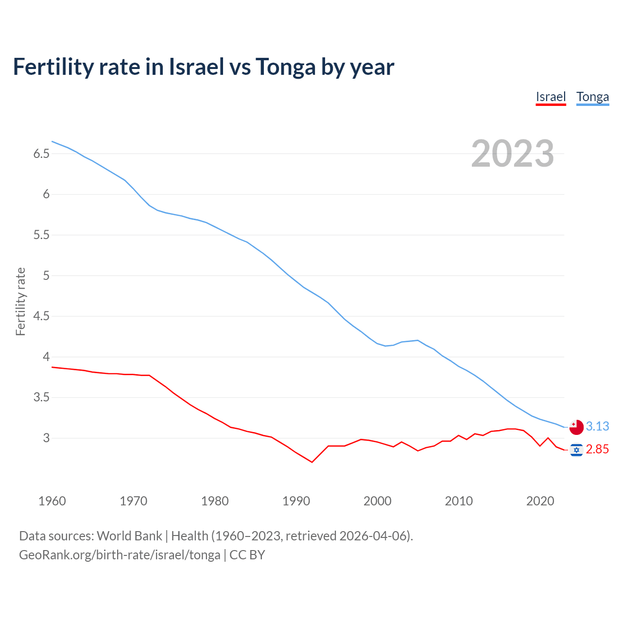 1960 vs 2023, the fertility rate has decreased by 26.3% in Israel and by 53% in Tonga — in 1960, it was 3.87 and 6.65, respectively.