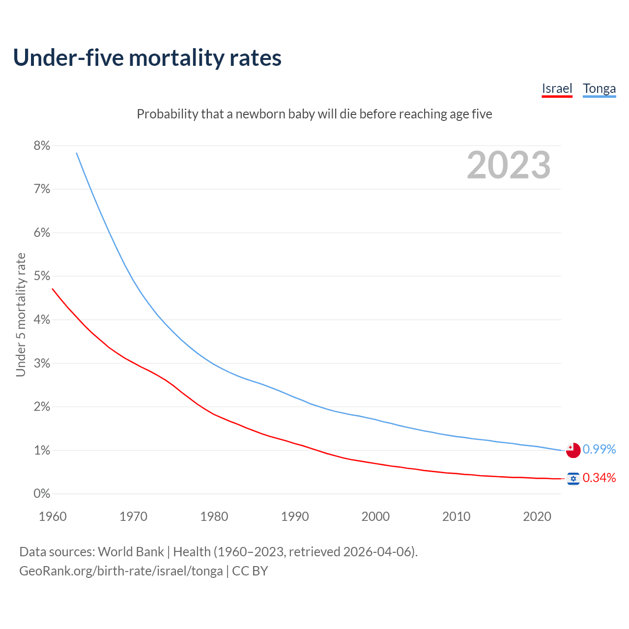 The chance that a newborn baby will die before reaching age five is 0.34% in Israel and 0.99% in Tonga. Above is a chart with historical data on under-five mortality rates.