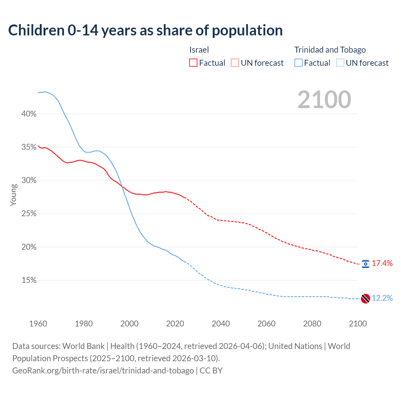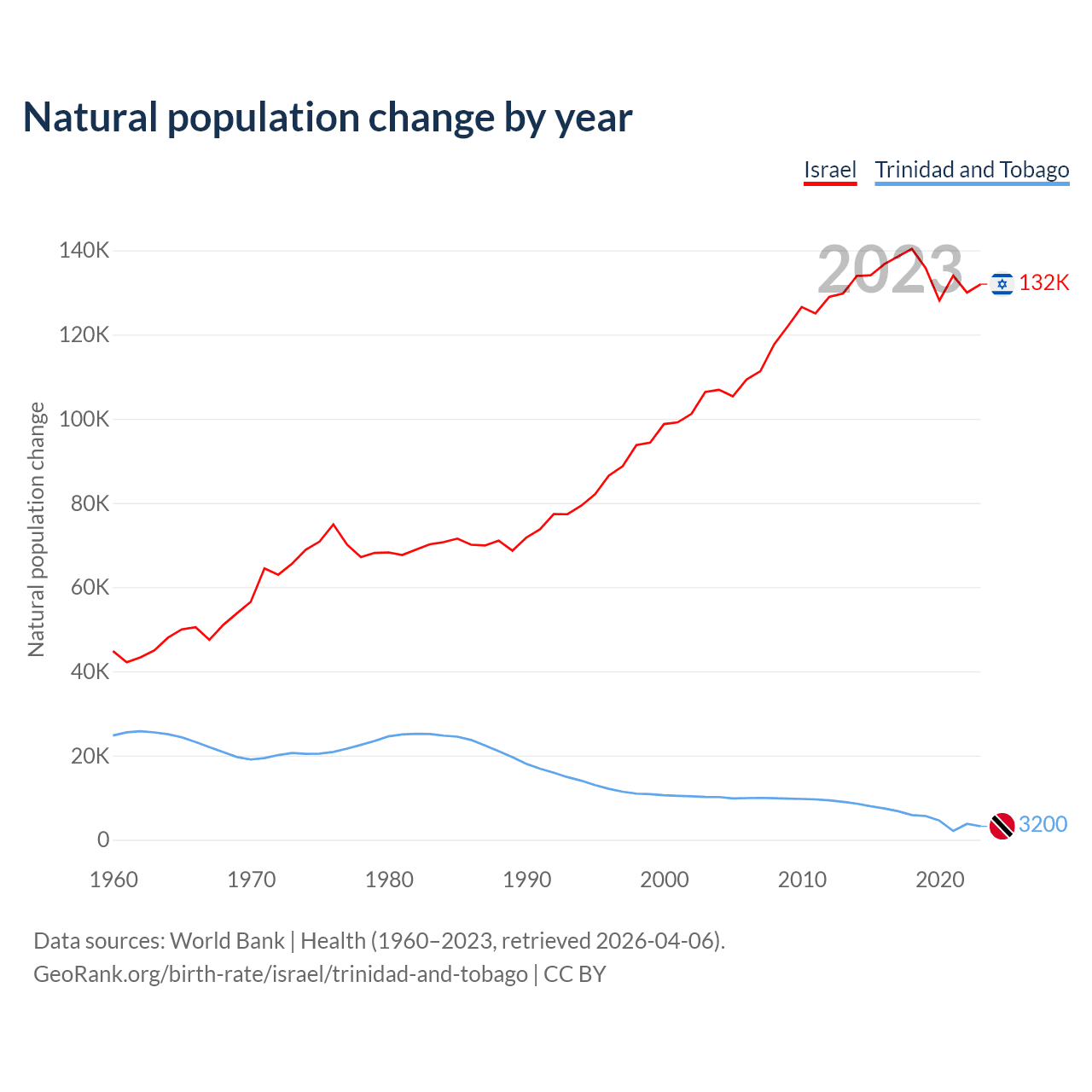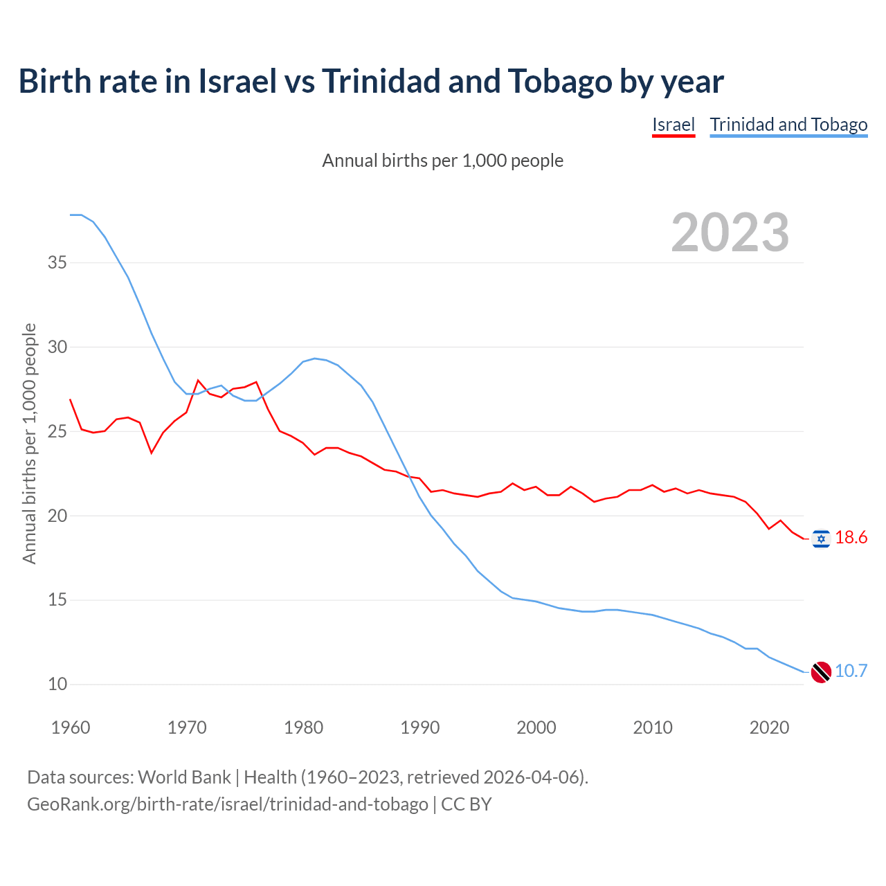 Israel has an annual birth rate of 18.6 births per 1,000 people, compared to 10.7 for Trinidad and Tobago. The average number of children a woman is expected to have during her lifetime — the fertility rate, is 2.85 in Israel and 1.53 in Trinidad and Tobago — 46.2% difference.