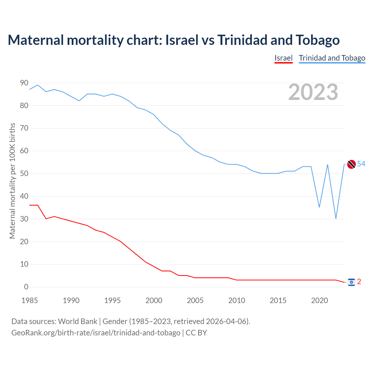 The maternal mortality rate, which is the probability of dying during childbirth or within 42 days of pregnancy termination, is 2 deaths per 100,000 live births in Israel, compared to 54 deaths in Trinidad and Tobago.