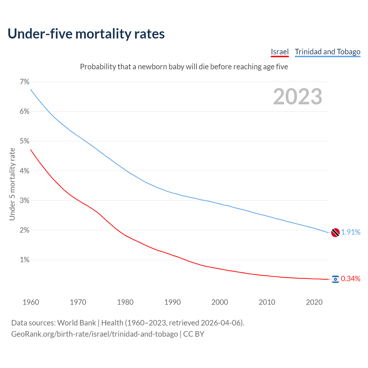 The chance that a newborn baby will die before reaching age five is 0.34% in Israel and 1.91% in Trinidad and Tobago. Above is a chart with historical data on under-five mortality rates.