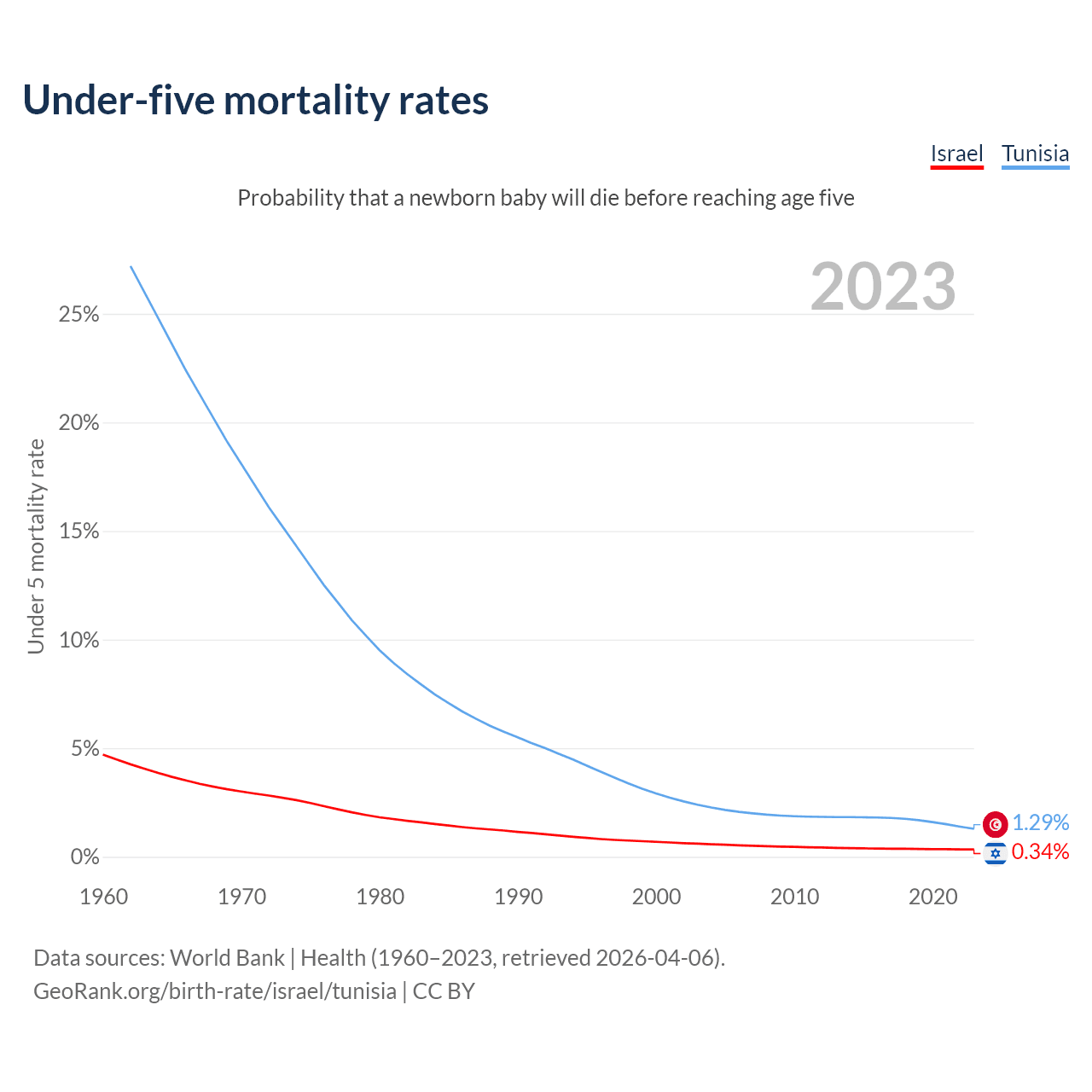 The chance that a newborn baby will die before reaching age five is 0.34% in Israel and 1.29% in Tunisia. Above is a chart with historical data on under-five mortality rates.