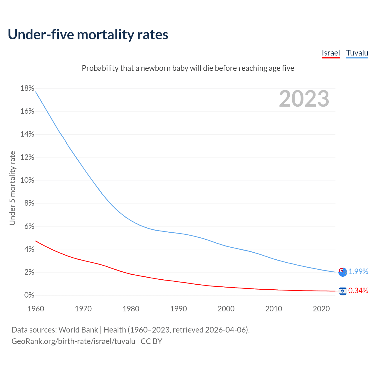 The chance that a newborn baby will die before reaching age five is 0.34% in Israel and 1.99% in Tuvalu. Above is a chart with historical data on under-five mortality rates.