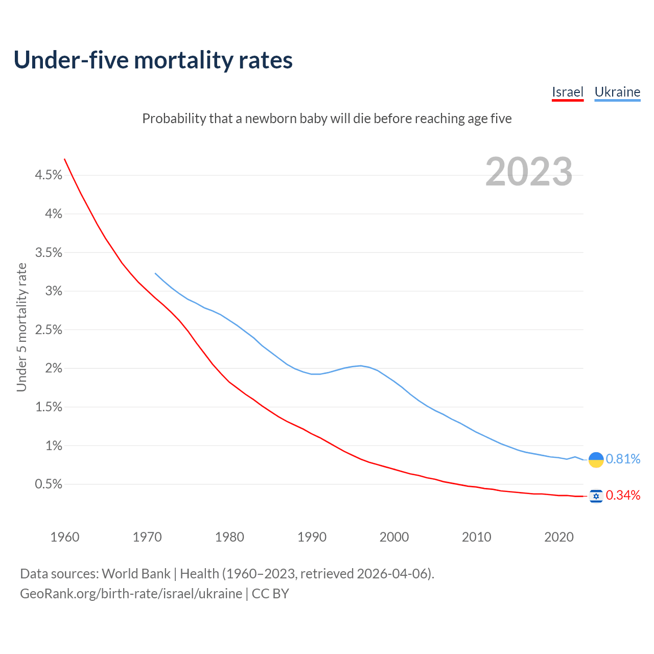 The chance that a newborn baby will die before reaching age five is 0.34% in Israel and 0.81% in Ukraine. Above is a chart with historical data on under-five mortality rates.