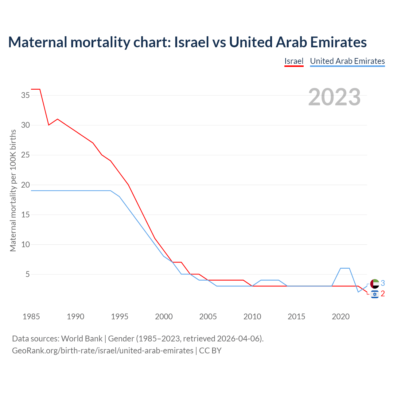 The maternal mortality rate, which is the probability of dying during childbirth or within 42 days of pregnancy termination, is 2 deaths per 100,000 live births in Israel, compared to 3 deaths in the United Arab Emirates.