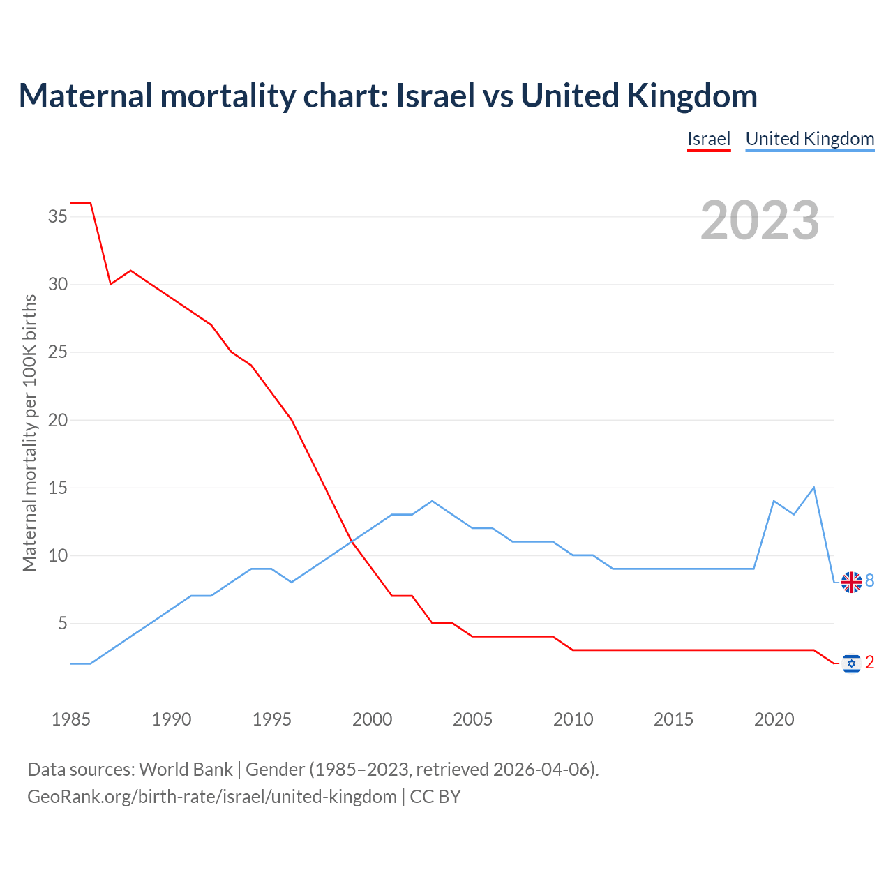 The maternal mortality rate, which is the probability of dying during childbirth or within 42 days of pregnancy termination, is 2 deaths per 100,000 live births in Israel, compared to 8 deaths in the United Kingdom.