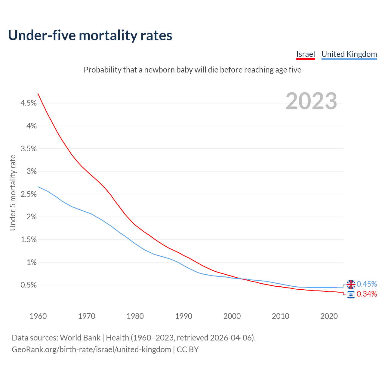 The chance that a newborn baby will die before reaching age five is 0.34% in Israel and 0.45% in the United Kingdom. Above is a chart with historical data on under-five mortality rates.