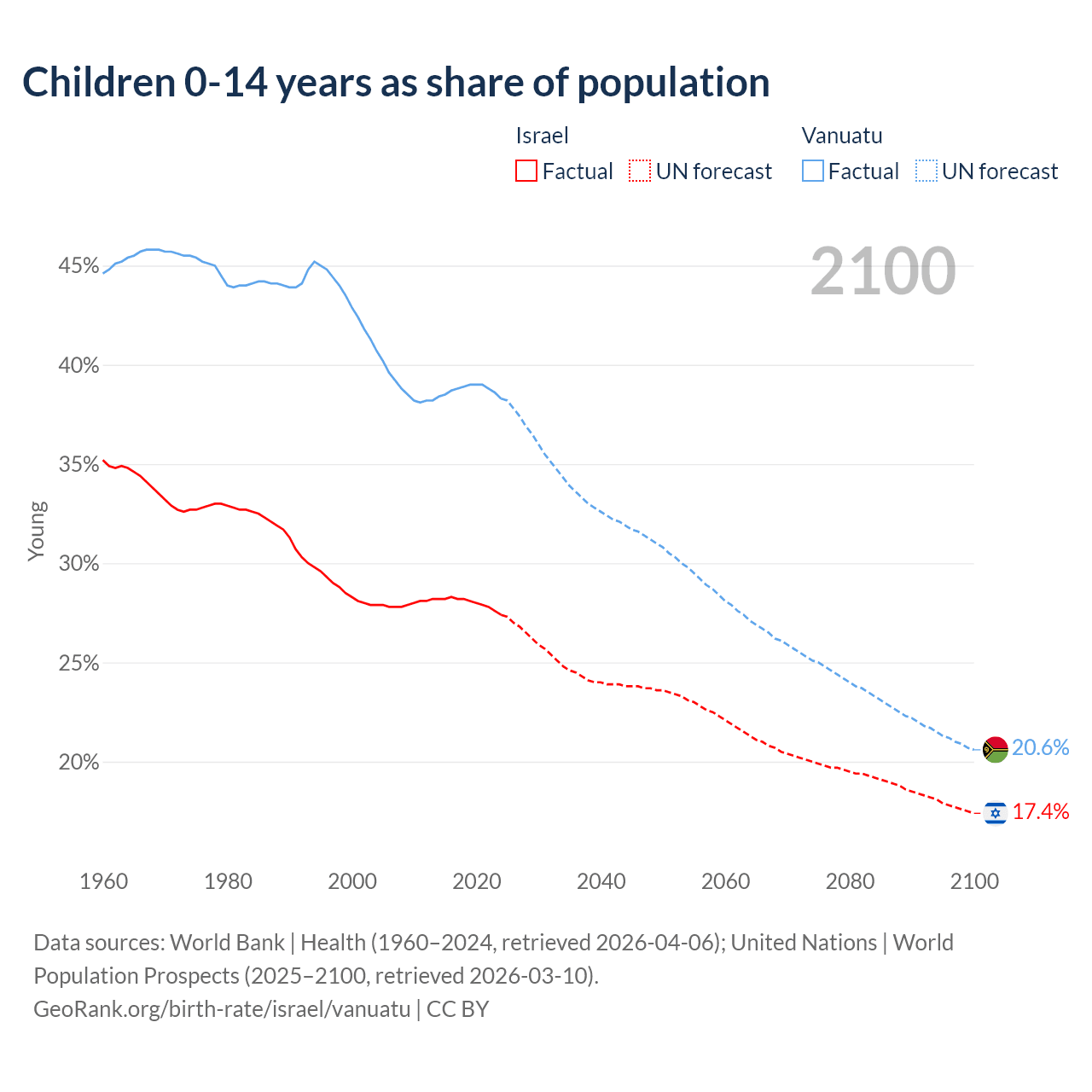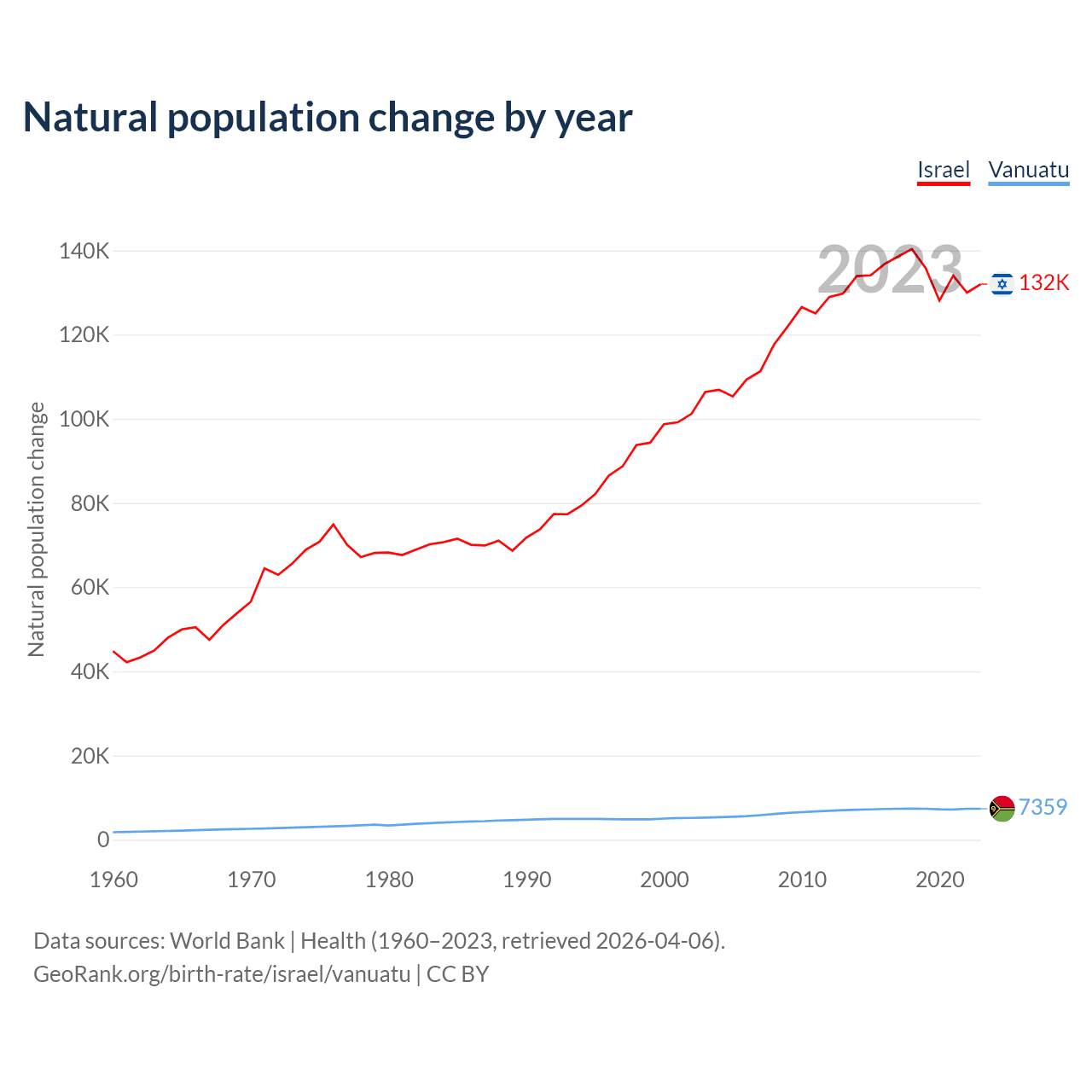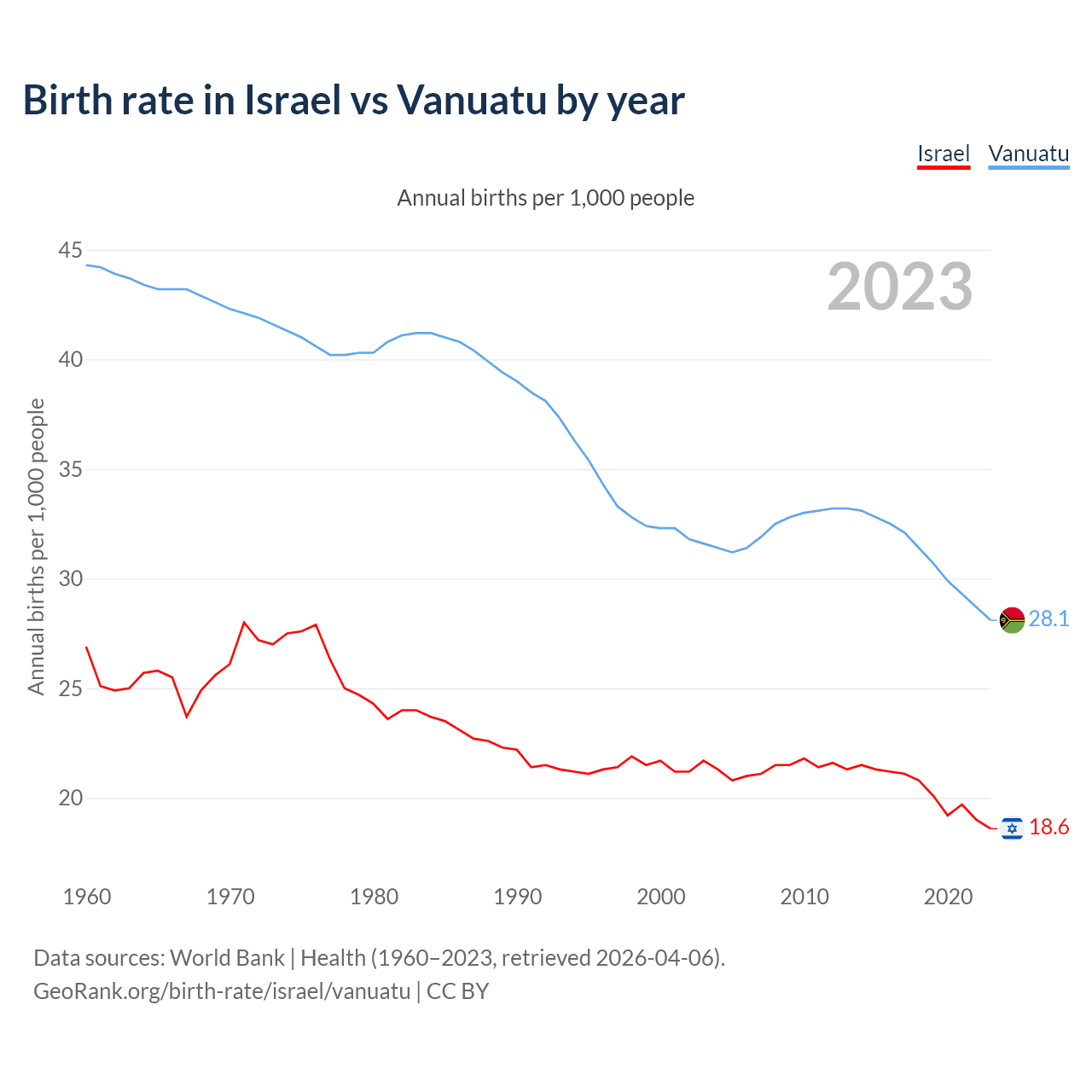 Israel has an annual birth rate of 18.6 births per 1,000 people, compared to 28.1 for Vanuatu. The average number of children a woman is expected to have during her lifetime — the fertility rate, is 2.85 in Israel and 3.6 in Vanuatu — 26.2% difference.