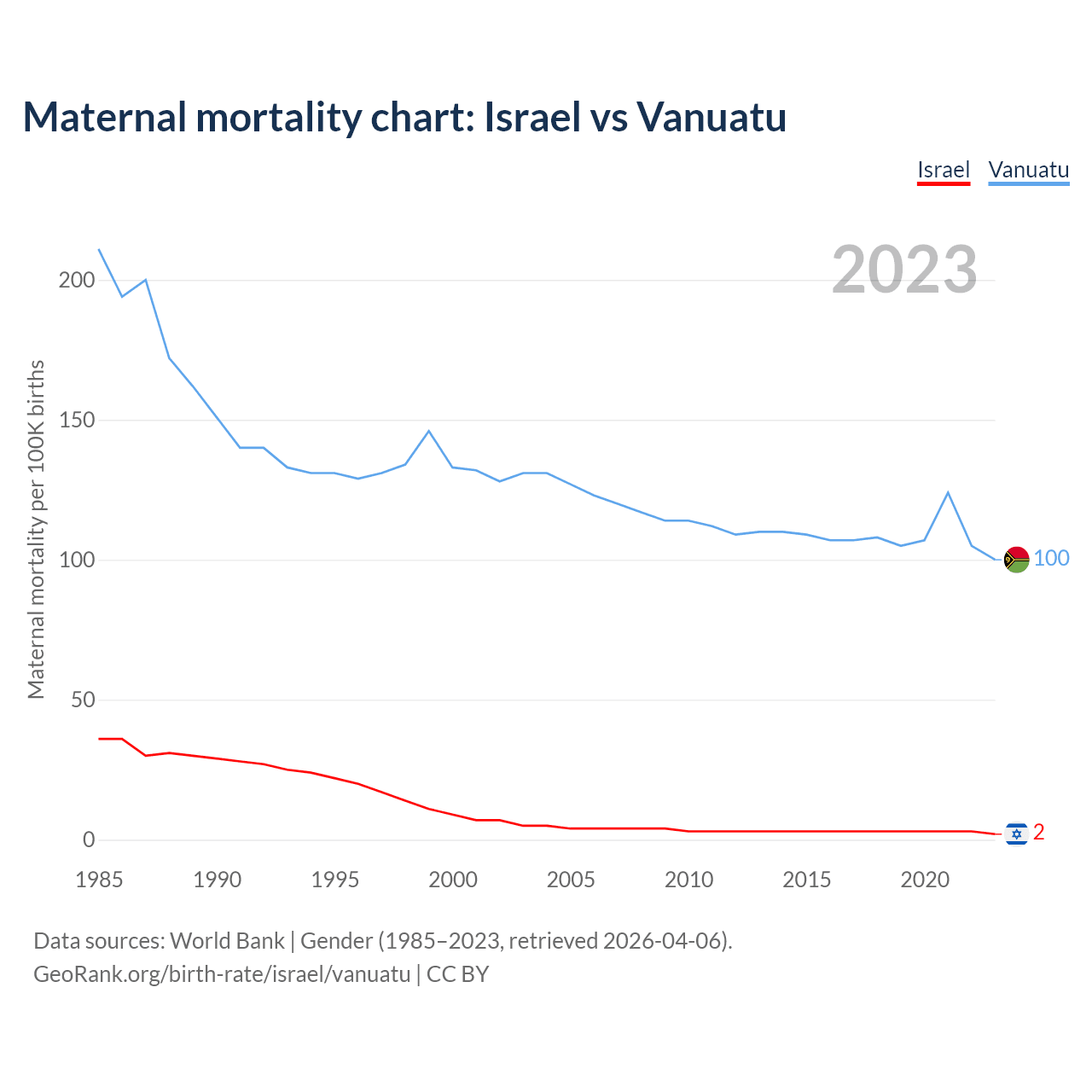 The maternal mortality rate, which is the probability of dying during childbirth or within 42 days of pregnancy termination, is 2 deaths per 100,000 live births in Israel, compared to 100 deaths in Vanuatu.