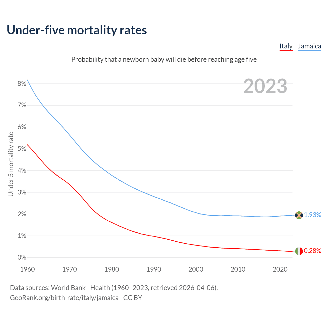 The chance that a newborn baby will die before reaching age five is 0.28% in Italy and 1.93% in Jamaica. Above is a chart with historical data on under-five mortality rates.
