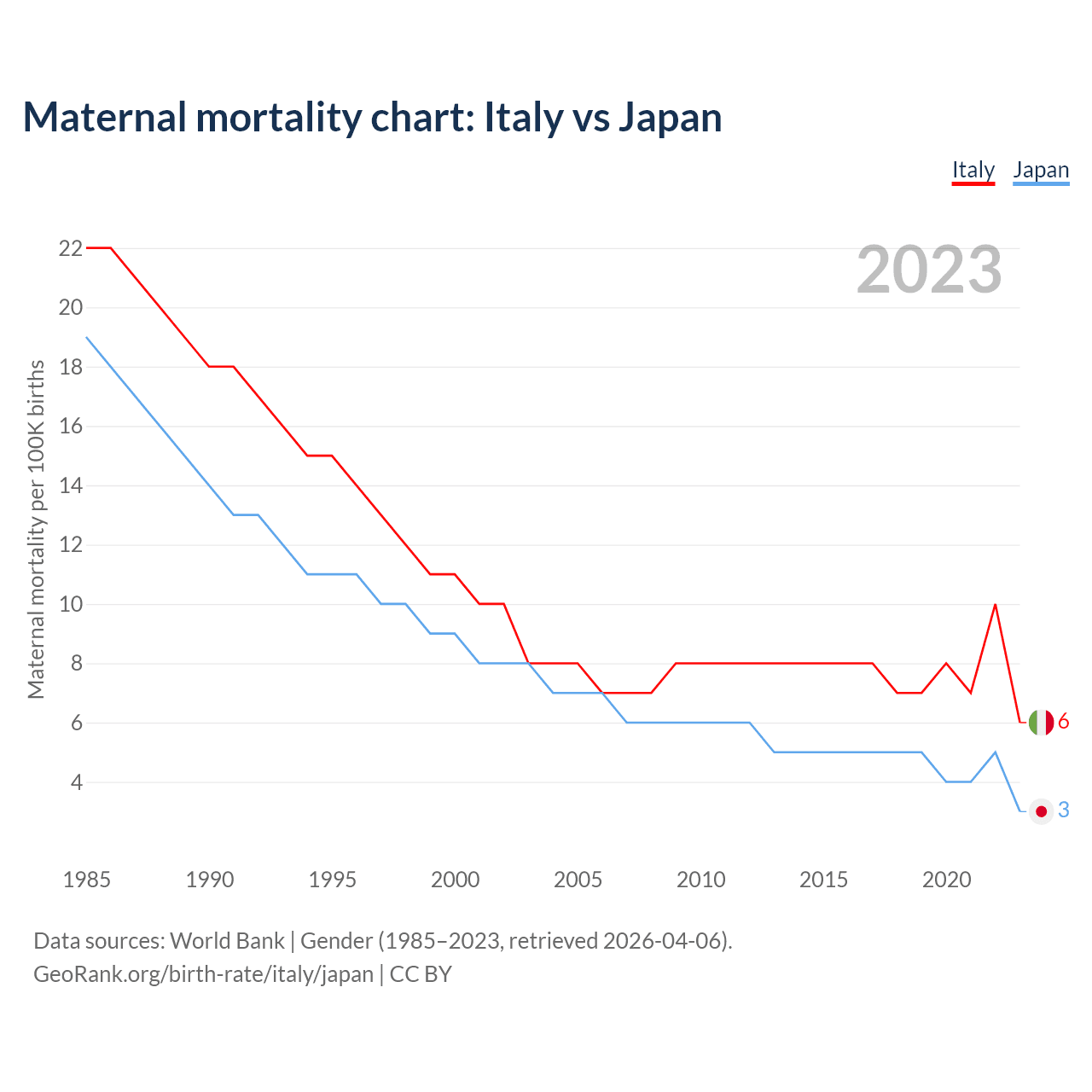 The maternal mortality rate, which is the probability of dying during childbirth or within 42 days of pregnancy termination, is 6 deaths per 100,000 live births in Italy, compared to 3 deaths in Japan.