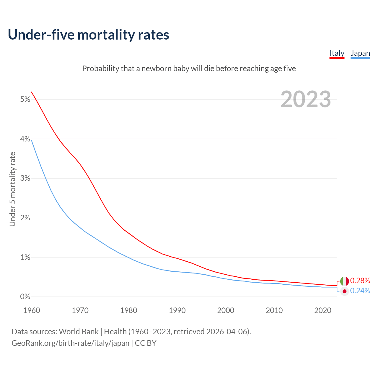 The chance that a newborn baby will die before reaching age five is 0.28% in Italy and 0.24% in Japan. Above is a chart with historical data on under-five mortality rates.