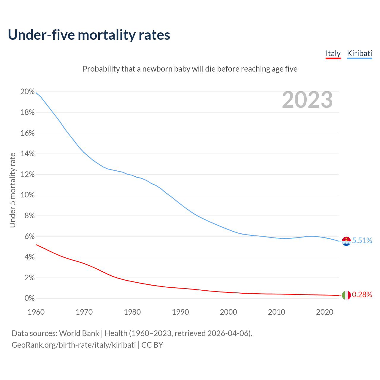 The chance that a newborn baby will die before reaching age five is 0.28% in Italy and 5.51% in Kiribati. Above is a chart with historical data on under-five mortality rates.