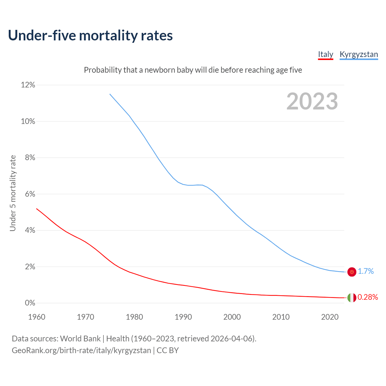 The chance that a newborn baby will die before reaching age five is 0.28% in Italy and 1.7% in Kyrgyzstan. Above is a chart with historical data on under-five mortality rates.