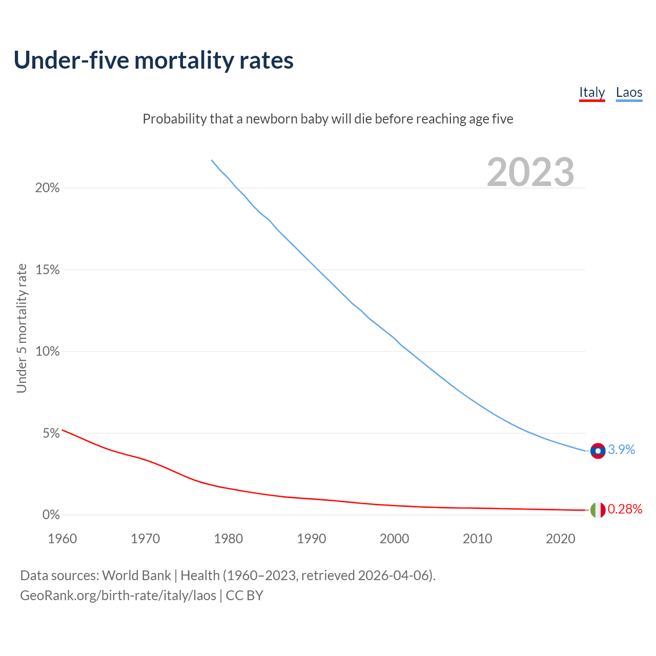 The chance that a newborn baby will die before reaching age five is 0.28% in Italy and 3.9% in Laos. Above is a chart with historical data on under-five mortality rates.