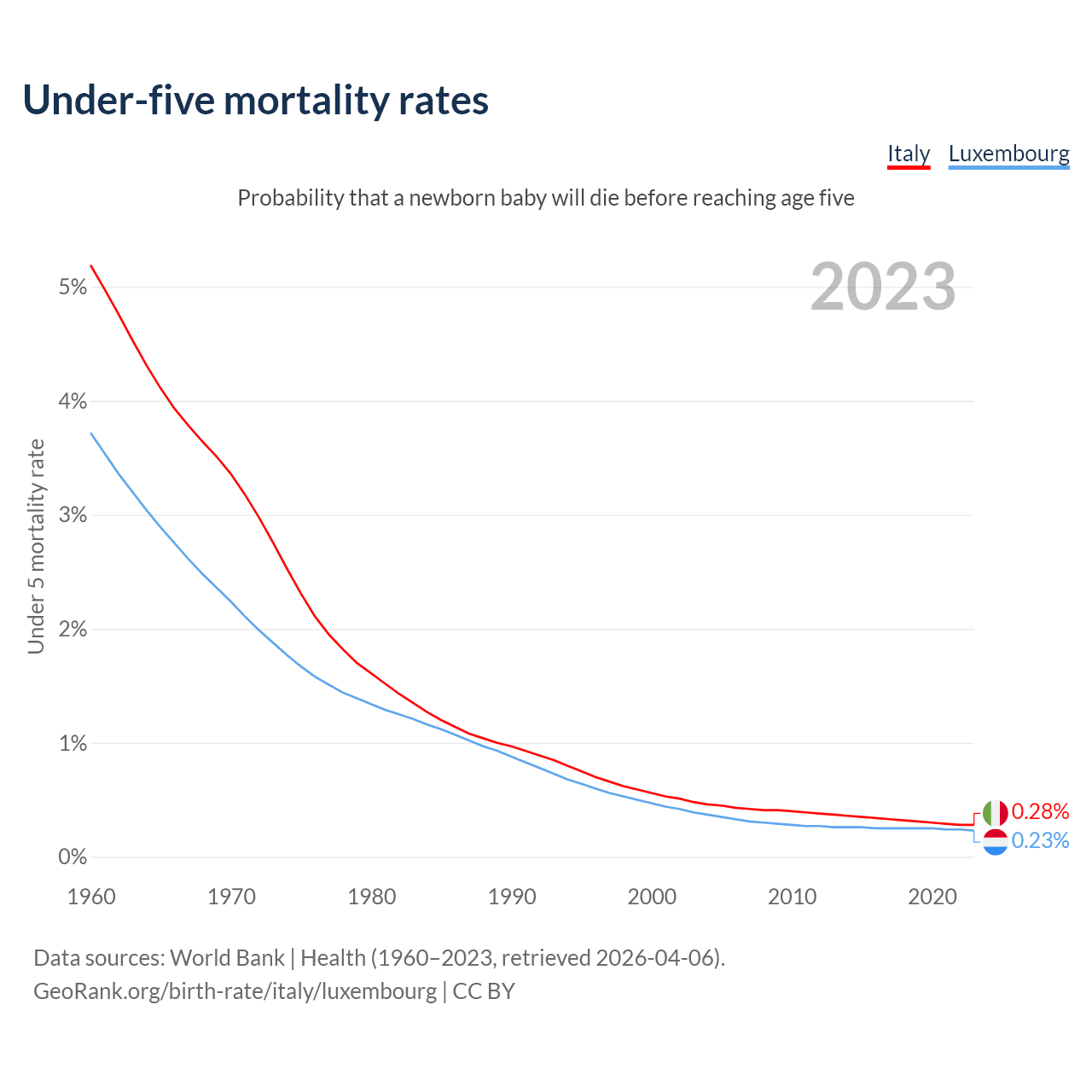 The chance that a newborn baby will die before reaching age five is 0.28% in Italy and 0.23% in Luxembourg. Above is a chart with historical data on under-five mortality rates.
