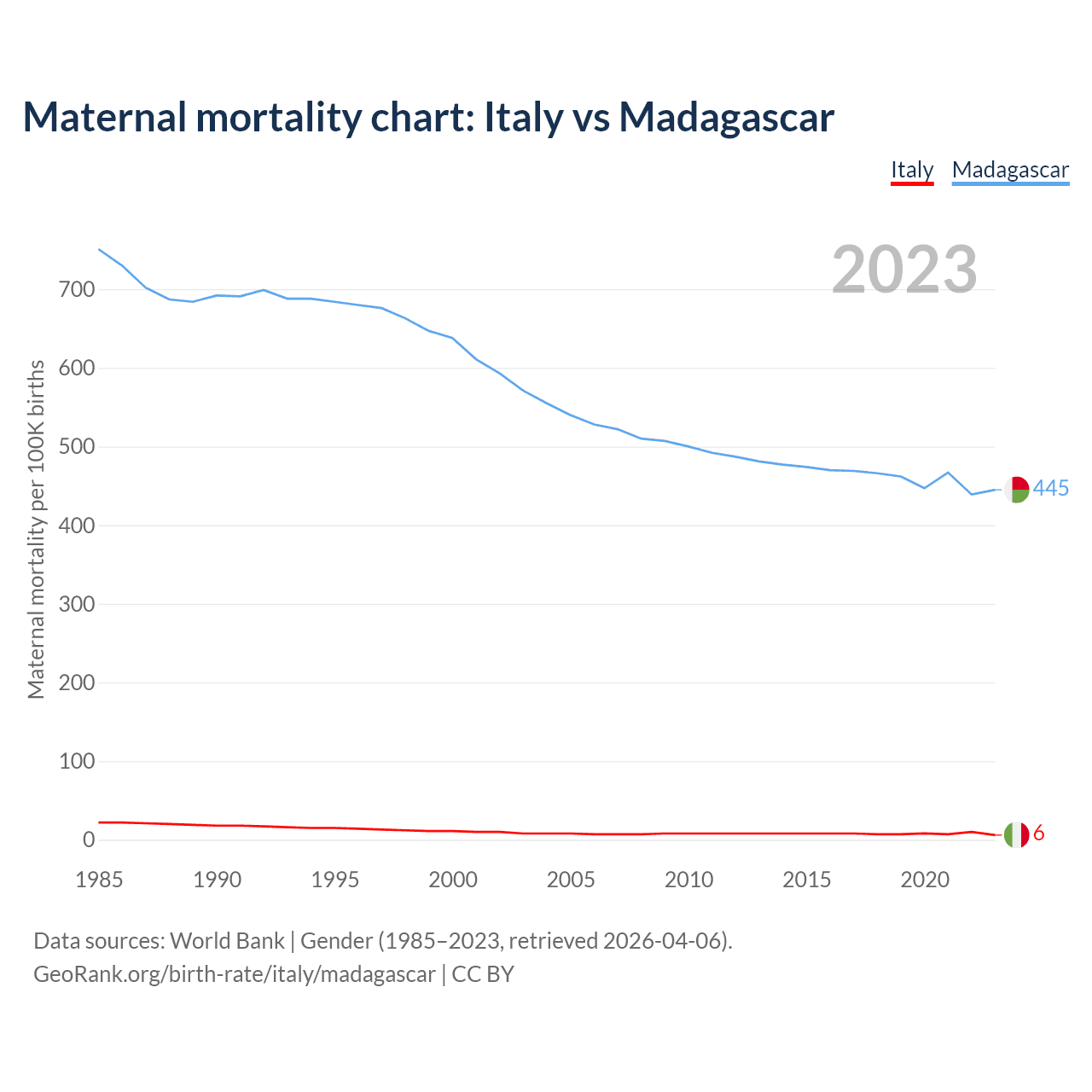 The maternal mortality rate, which is the probability of dying during childbirth or within 42 days of pregnancy termination, is 6 deaths per 100,000 live births in Italy, compared to 445 deaths in Madagascar.