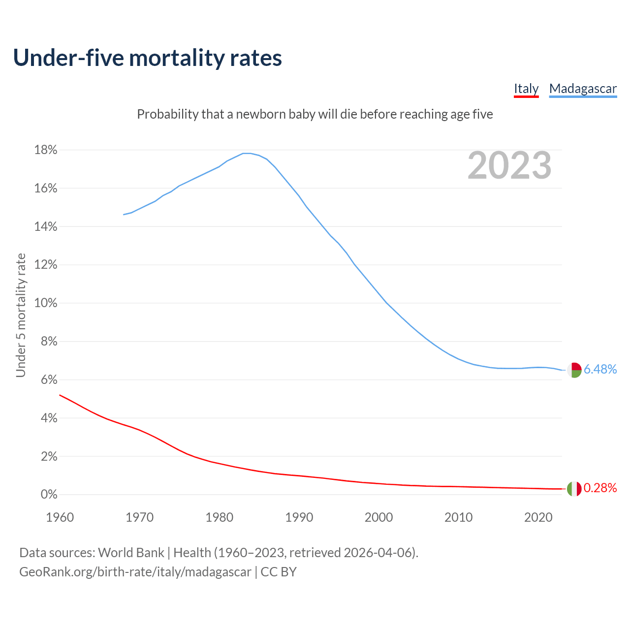 The chance that a newborn baby will die before reaching age five is 0.28% in Italy and 6.48% in Madagascar. Above is a chart with historical data on under-five mortality rates.