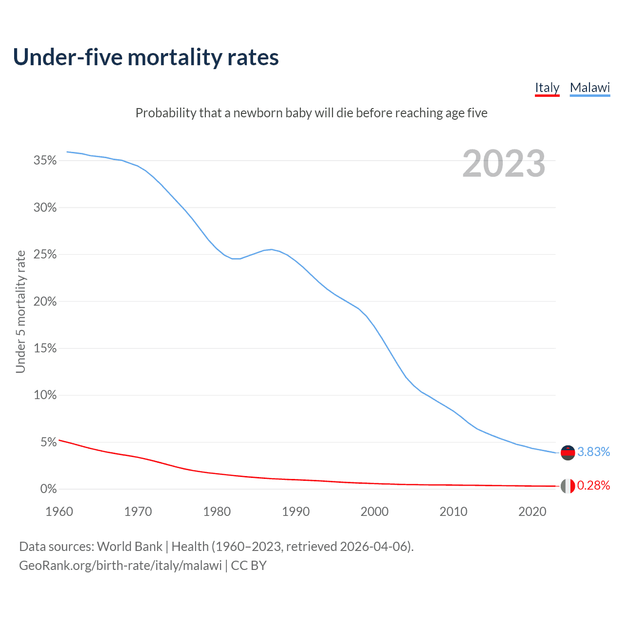 The chance that a newborn baby will die before reaching age five is 0.28% in Italy and 3.83% in Malawi. Above is a chart with historical data on under-five mortality rates.