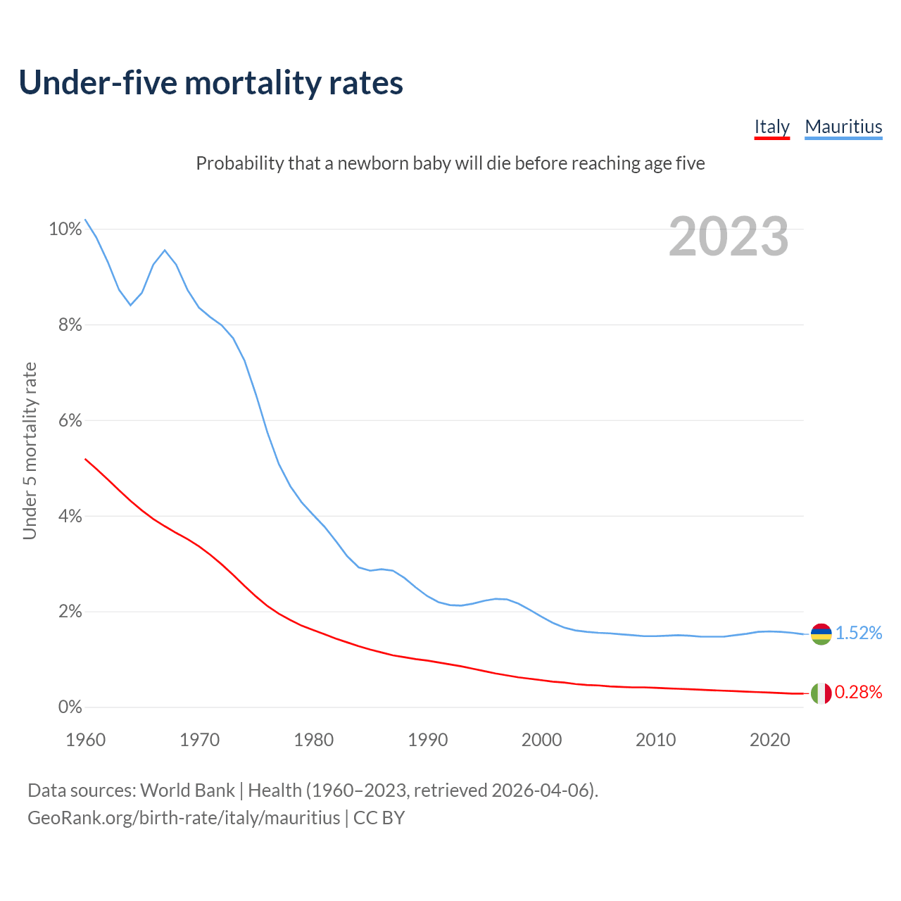 The chance that a newborn baby will die before reaching age five is 0.28% in Italy and 1.52% in Mauritius. Above is a chart with historical data on under-five mortality rates.