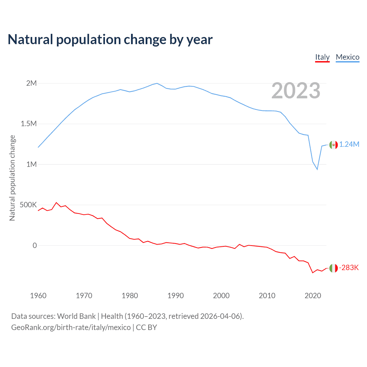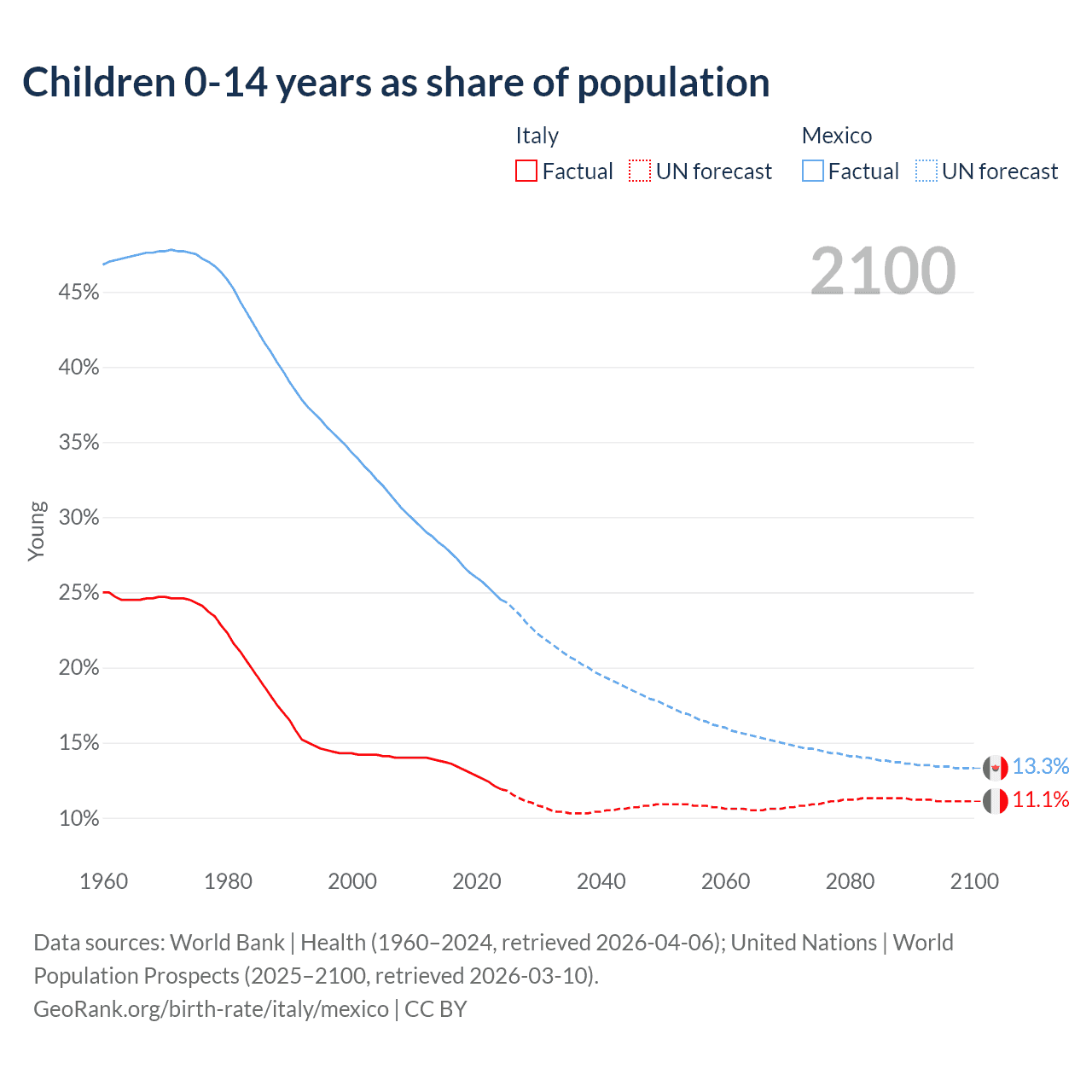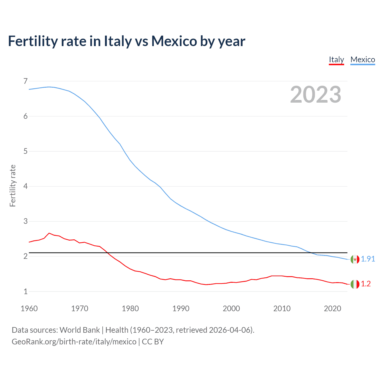 According to the latest available data on birth rates, the fertility rate in Italy was 1.2 children per woman in 2023, compared to 1.91 in Mexico in 2023. The replacement level is considered to be 2.1 children per woman.