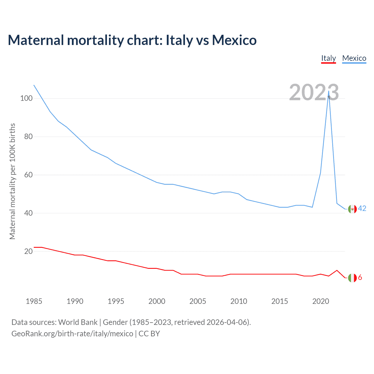The maternal mortality rate, which is the probability of dying during childbirth or within 42 days of pregnancy termination, is 6 deaths per 100,000 live births in Italy, compared to 42 deaths in Mexico.