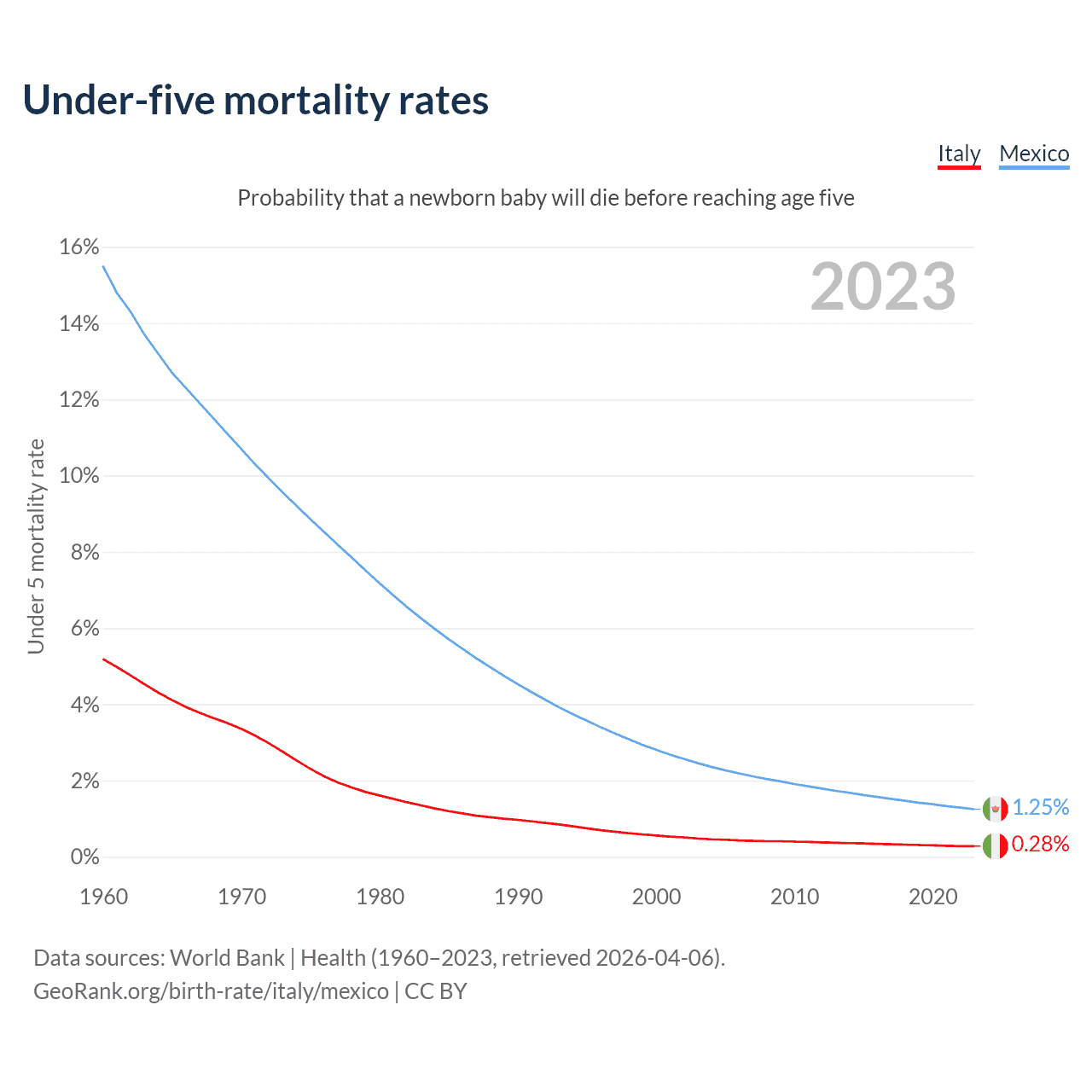 The chance that a newborn baby will die before reaching age five is 0.28% in Italy and 1.25% in Mexico. Above is a chart with historical data on under-five mortality rates.