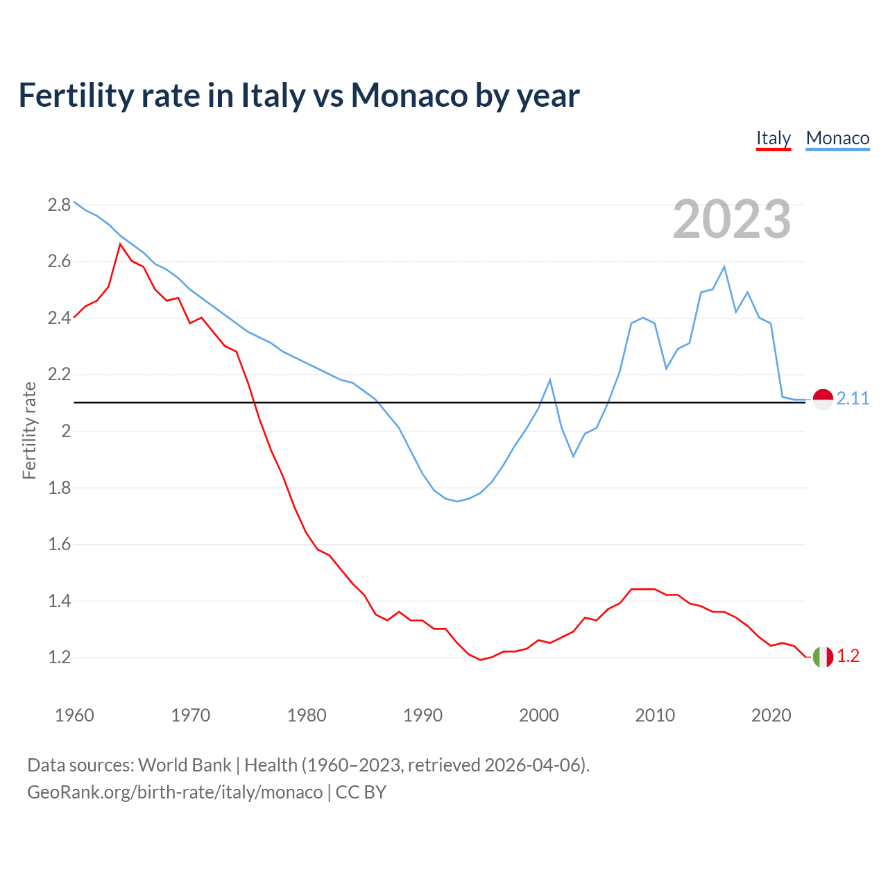 According to the latest available data on birth rates, the fertility rate in Italy was 1.2 children per woman in 2023, compared to 2.11 in Monaco in 2023. The replacement level is considered to be 2.1 children per woman.