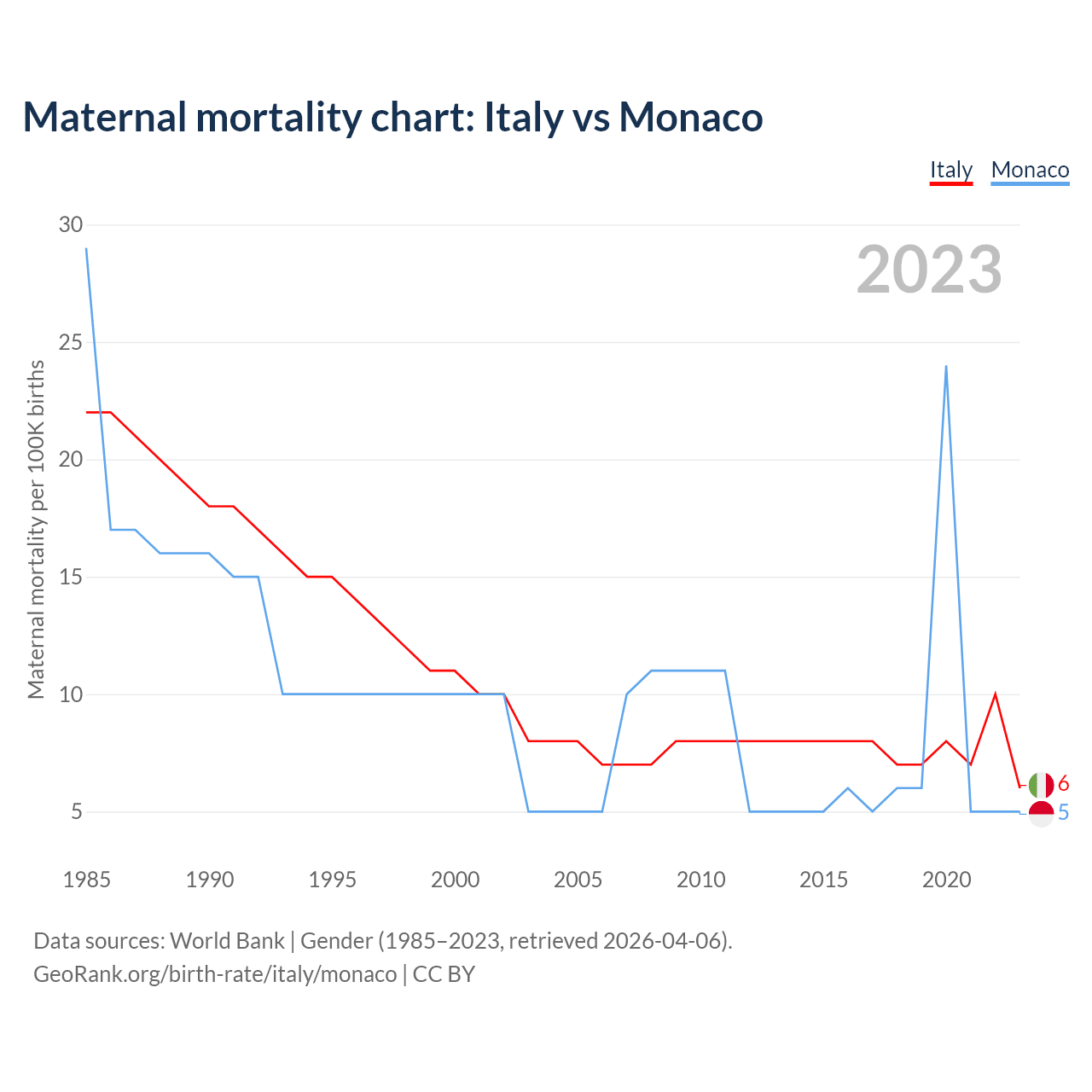 The maternal mortality rate, which is the probability of dying during childbirth or within 42 days of pregnancy termination, is 6 deaths per 100,000 live births in Italy, compared to 5 deaths in Monaco.