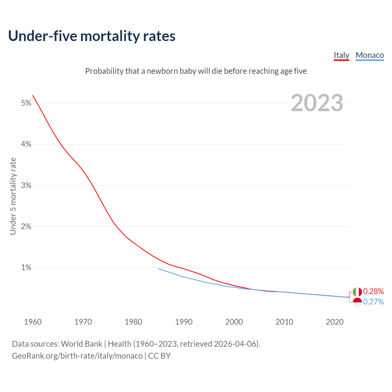The chance that a newborn baby will die before reaching age five is 0.28% in Italy and 0.27% in Monaco. Above is a chart with historical data on under-five mortality rates.