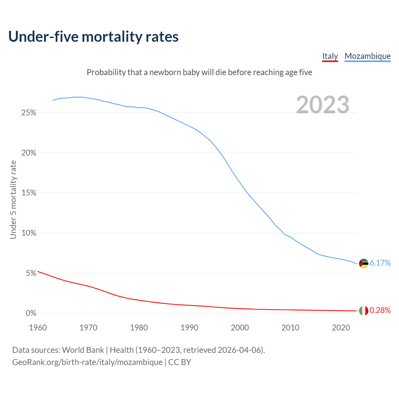 The chance that a newborn baby will die before reaching age five is 0.28% in Italy and 6.17% in Mozambique. Above is a chart with historical data on under-five mortality rates.