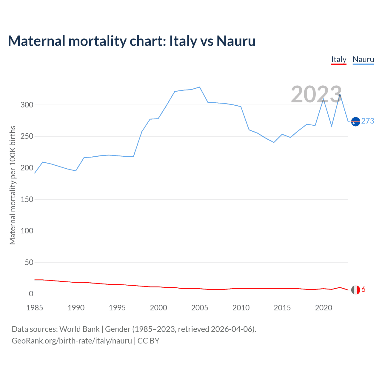The maternal mortality rate, which is the probability of dying during childbirth or within 42 days of pregnancy termination, is 6 deaths per 100,000 live births in Italy, compared to 273 deaths in Nauru.