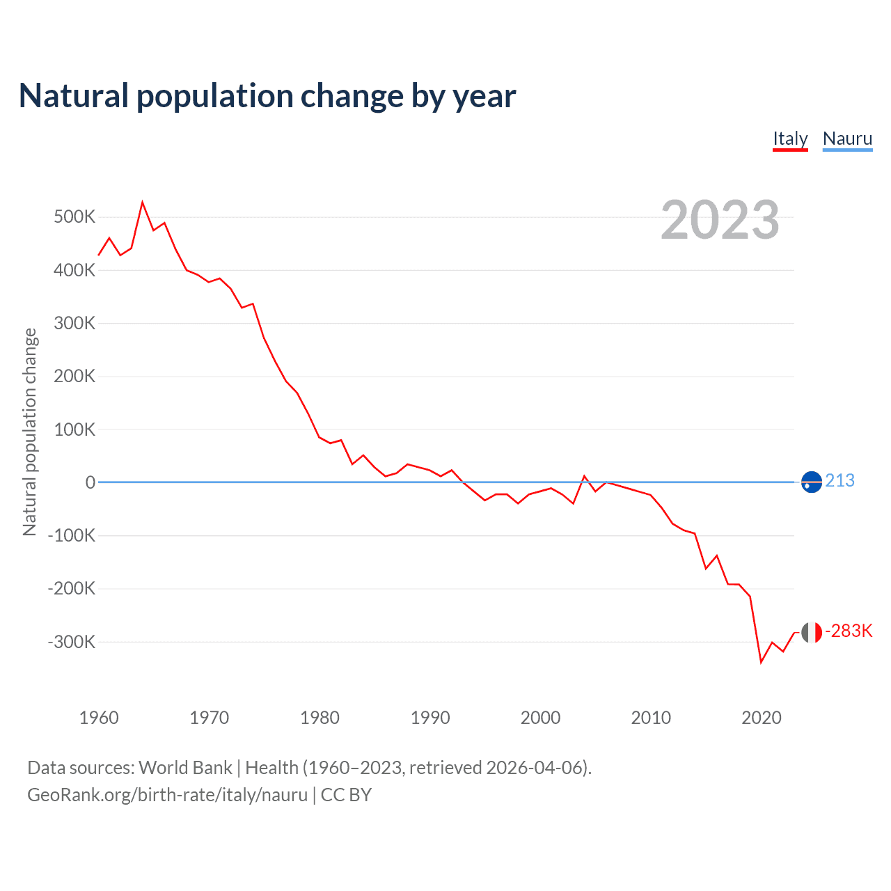 According to the latest available data on birth rates, the fertility rate in Italy was 1.2 children per woman in 2023, compared to 3.33 in Nauru in 2023. The replacement level is considered to be 2.1 children per woman.