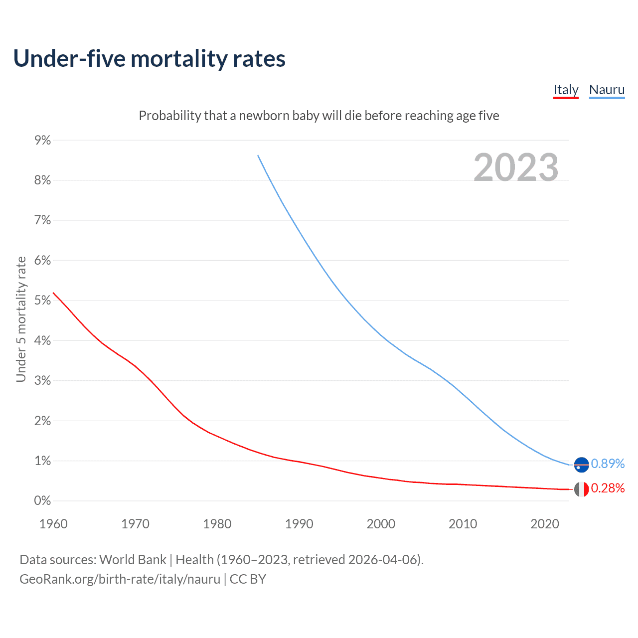 The chance that a newborn baby will die before reaching age five is 0.28% in Italy and 0.89% in Nauru. Above is a chart with historical data on under-five mortality rates.