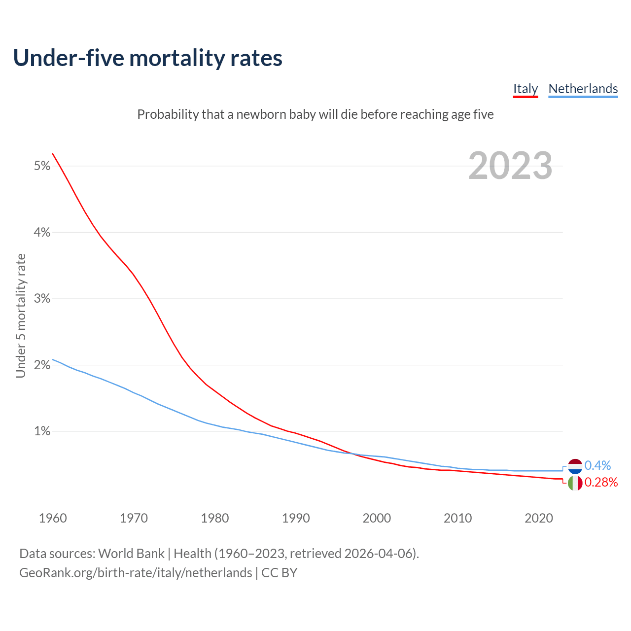 The chance that a newborn baby will die before reaching age five is 0.28% in Italy and 0.4% in the Netherlands. Above is a chart with historical data on under-five mortality rates.