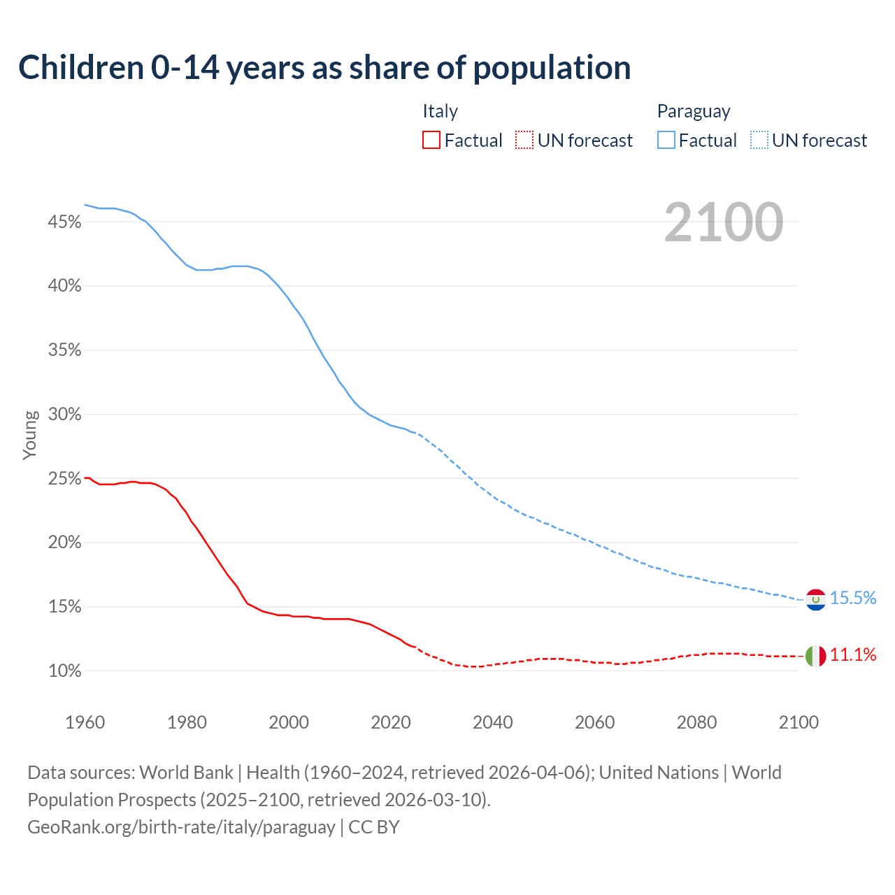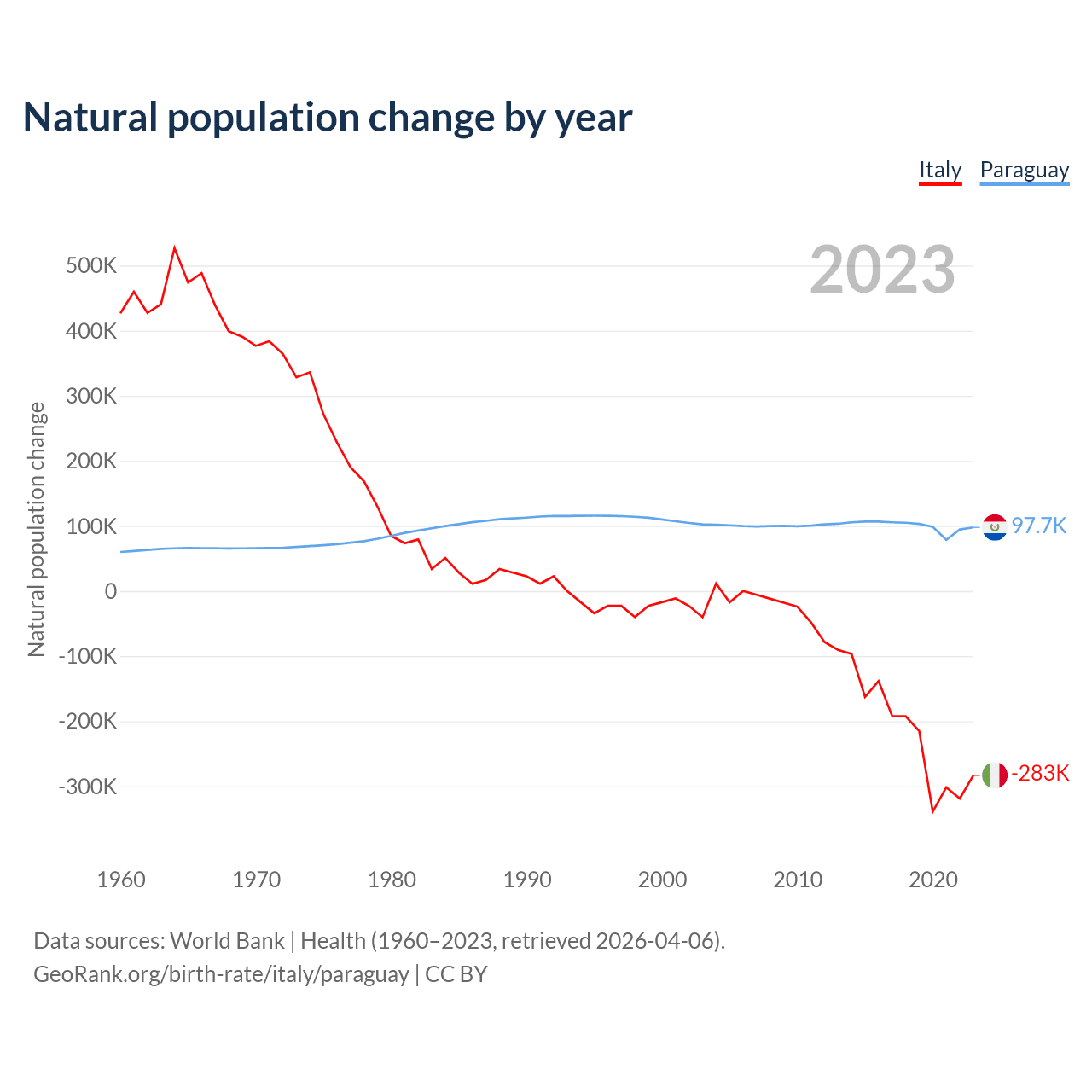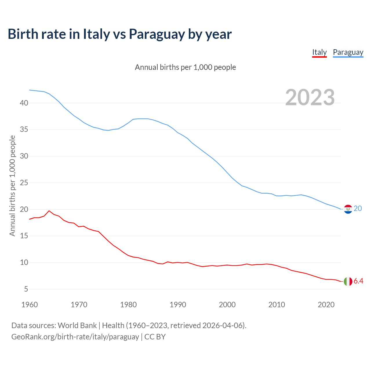 According to the latest available data on birth rates, the fertility rate in Italy was 1.2 children per woman in 2023, compared to 2.42 in Paraguay in 2023. The replacement level is considered to be 2.1 children per woman.