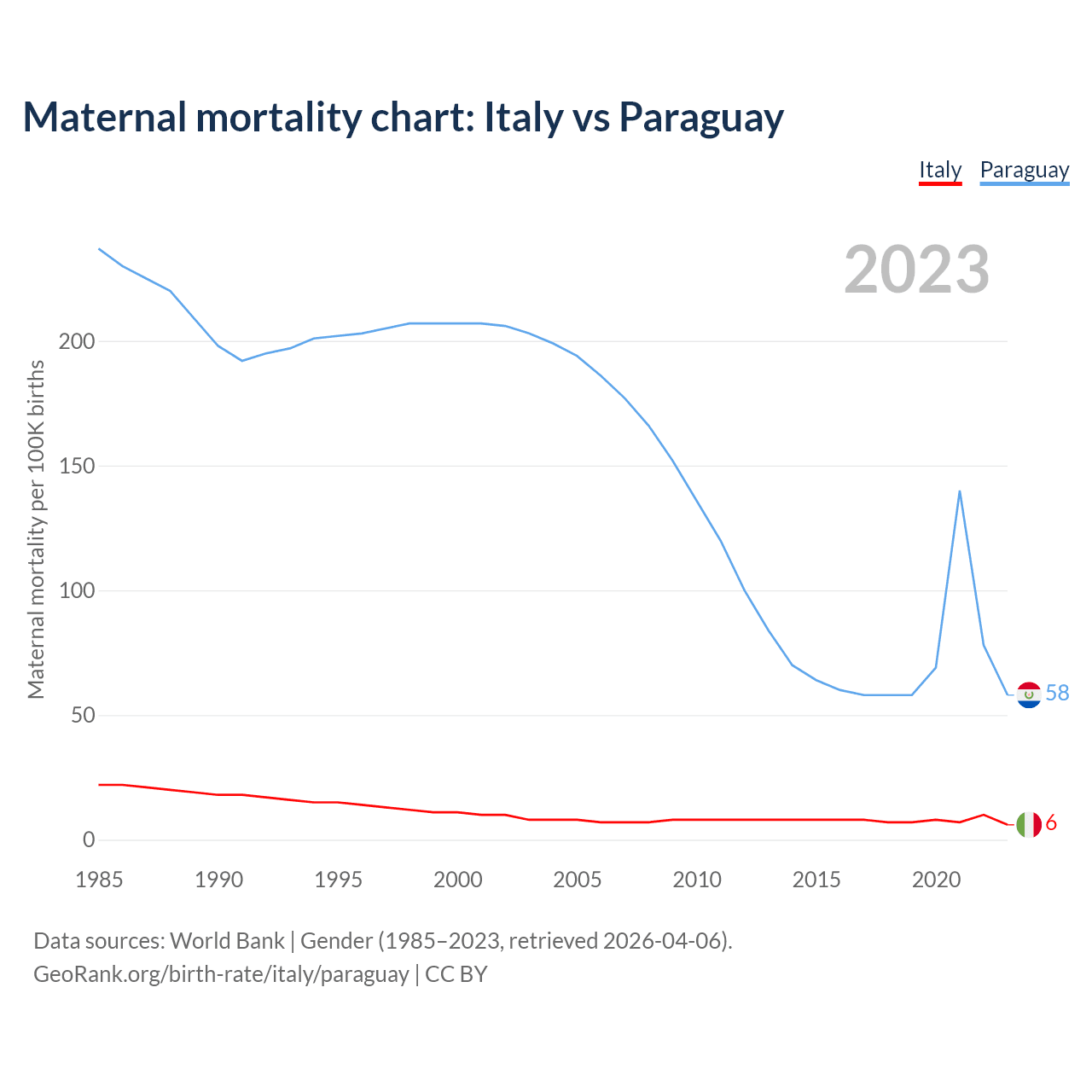 The maternal mortality rate, which is the probability of dying during childbirth or within 42 days of pregnancy termination, is 6 deaths per 100,000 live births in Italy, compared to 58 deaths in Paraguay.